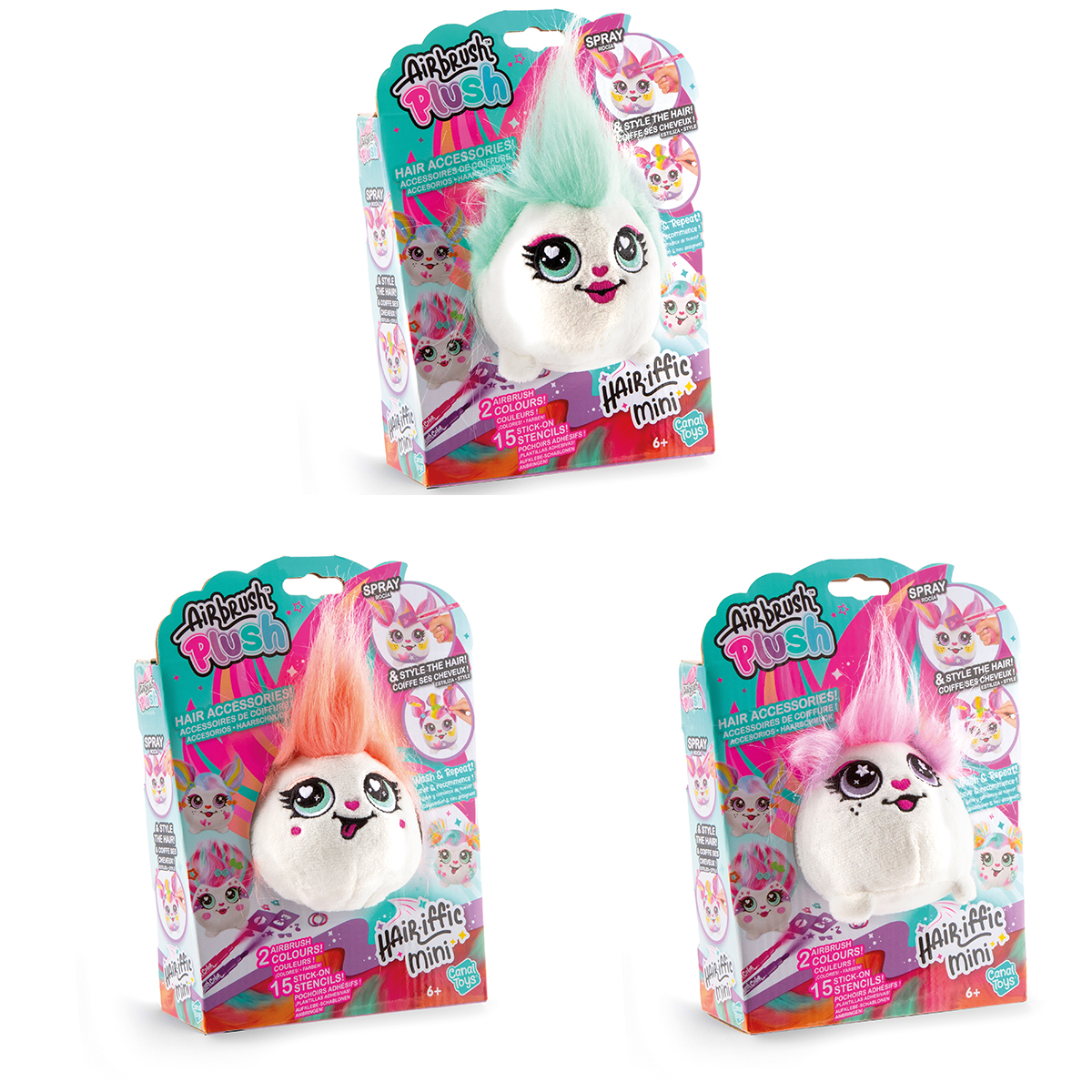 Färbe dein Plüsch mit deinem Airbrush-Spray, deinen Markern und deinen Schablonen. Stylen Sie sein Haar auf lustige Weise mit dem mitgelieferten Zubehör! Wasche dein Plüsch und mach es noch einmal! 4 Minifiguren zum Sammeln (Pixie, Punkie, Pinkie, Posh).