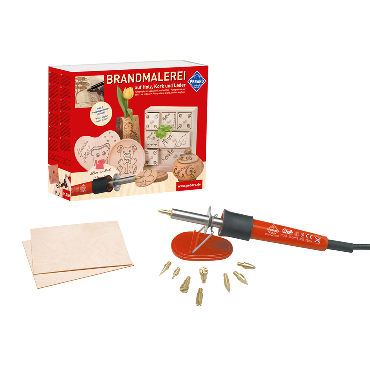 Holzbrennset 13-tlg, mit Brennstab mit ergonomischem Soft Grip, Auflageböckchen, 2 Pappelsperrholzplatten, 6 Brennspitzen, 3 Brennstempel und Schmirgelpapier. Zum Schreiben, Zeichnen, Dekorieren sowie Brennen dünner Linien und Ornamente auf Holz, Leder, Kork, etc. Inklusive Anleitung.