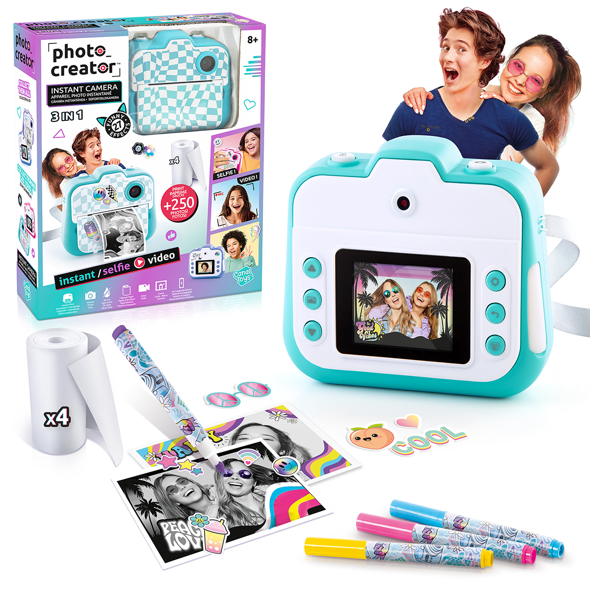 Mit dieser Kamera kannst du stundenlang Spaß haben und kreativ werden. Nimm deine Videos oder Fotos auf. Füge lustige Effekte hinzu und drucke die Fotos sofort aus! Du kannst mit Markern und Aufklebern individuell gestalten! Drucke über 250 Fotos. 4 Farben zum Sammeln! Inhalt : 1 Kamera, 1 USB-Kabel, 1 Handschlaufe, 4 Papierrollen, 1 Aufkleberbogen, 2 Kameradekorationen, Aufkleberbogen, 4 Marker, 1 Handbuch