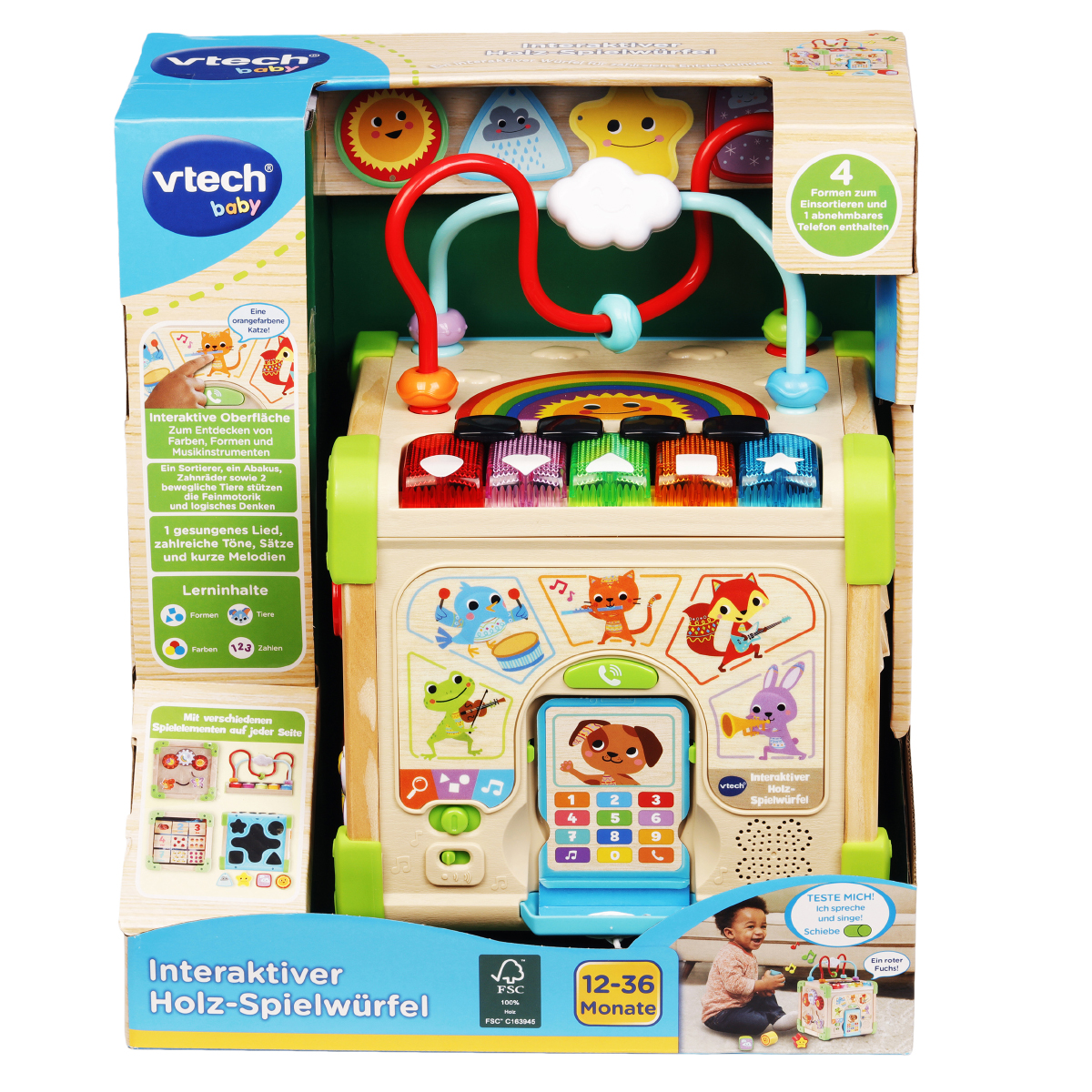 Nachhaltig produzierter Lernwürfel für kunterbunten Spielspaß. Liebevoll gestalteter Holzwürfel mit individuellen Würfelseiten und verschiedenen Elementen. 3 Spielmodi: Musik, Lernen, Entdecken. 5 Klaviertasten für Farben, Formen und Musik. Auf dem Würfel befinden sich bunte Holzperlen, die man über den Abakus schieben kann. Berührt das Kind die Tiere, stellen sie sich vor und verraten, welche Instrumente sie spielen.Lerninhalte: Formen, Farben, Zahlen, Zählen. Abnehmbares Telefon: Als Rassel benutzen oder Tierfreunde anrufen. Zahlenblöcke drehen, um bunte Tiere oder Objekte zu entdecken und zu zählen. Das Drehen der Zahnräder und das Verschieben der Tiere schult die Feinmotorik. 1 gesungenes Lied und zahlreiche kurze Melodien. Kindersicheres Batteriefach, Abschaltautomatik und Lautstärkeregler
