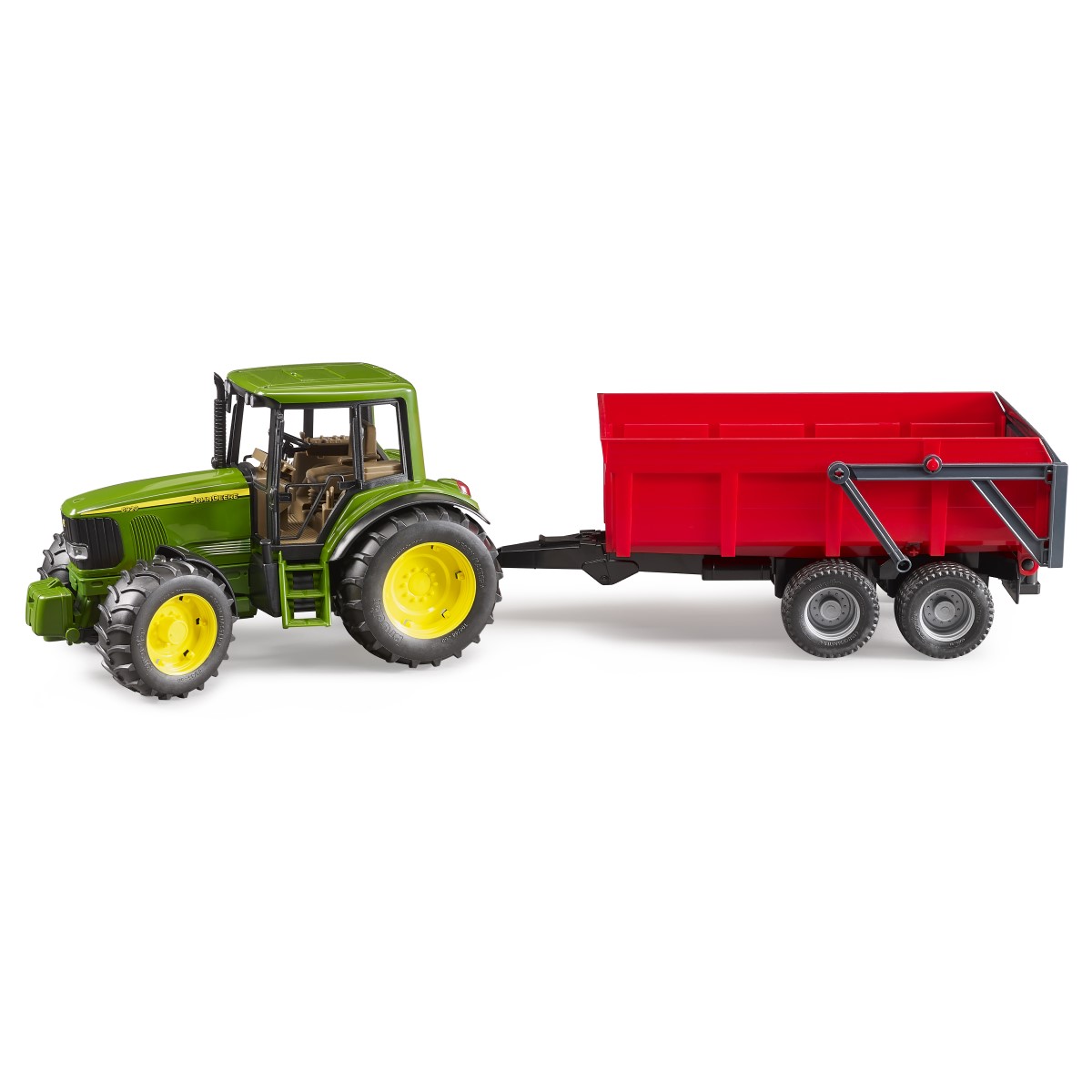 Der John Deere 6920 ist ein leistungsstarker und zuverlässiger Helfer in der Landwirtschaft. Auch im Sortiment von BRUDER ist dieses Modell nicht mehr wegzudenken. Die Motorhaube kann geöffnet werden und gibt so den Blick auf den Motorblock frei. Die Lenkung der geländegängigen Pendelvorderachse kann sowohl direkt über das Lenkrad im Fahrerhaus, als auch über eine mitgelieferte Lenkstangenverlängerung erfolgen, welche die Kinder durch das Schiebedach im Fahrerhaus auf das Lenkrad stecken können. Die Mulde des Wannenkippanhängers ist zum Hochklappen, wobei sich die Rückwand automatisch öffnet. Bei umstecken des Gestänges, kann der Getreideauslaufschieber verwendet werden. Profilreifen runden das Bild ab. Alle der zahlreich vorhandenen Anhänger und Anhängegeräte der Profi-Serie können mit dem John Deere 6920 Traktor kombiniert werden, um den kleinen „Landwirten“ das Bestellen der Felder und damit die Produktion landwirtschaftlicher Erzeugnisse begreifbar zu machen.