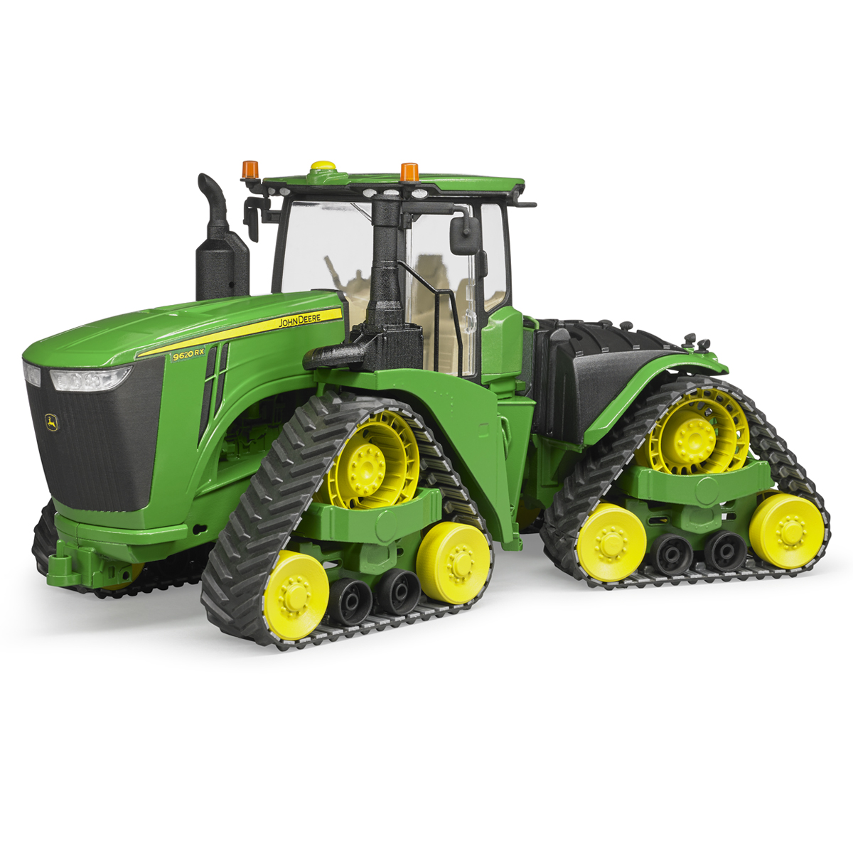 Weil die Anforderungen an moderne Agrarbetriebe immer grösser werden, ist es heute wichtiger denn je, die Leistungsfähigkeit Ihrer Maschinen zu steigern. Mit dem 9620RX stellt John Deere den bis dato stärksten und grössten Raupentraktor vor. Mit einer Motorleistung von bis zu 670 PS und seinen vier Raupenlaufwerken, die ihm sagenhafte Zugkraft bei gleichzeitig bestmöglicher Bodenschonung bescheren, ist er der perfekter Partner, wenn es darum geht, schwerste Zugarbeiten mit Anbaugeräten wie Grubber, Pflug und Säh-Kombination zu meistern. Dieser imposante Traktor ist nun auch im Massstab 1:16 in einzigartiger Detailtreue, neu bei BRUDER im Sortiment. Wie das Original, besitzt das Modell einen neu entwickelten Raupenantrieb, sowie die geländegängige Knicklenkung. Die Fahrerkabine besitzt eine Türe zum Öffnen und auch die imposante Motorhaube lässt sich aufklappen und zeigt den riesigen Motor. An die Anhängekupplung mit höhenverstellbarem Hubwerk können zahlreiche Anhängegeräte aus dem landwirtschaftlichen Sortiment von BRUDER angebracht werden.
