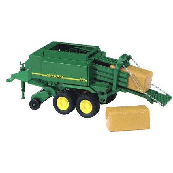 Der ausfahrbare Standfuss gibt der John Deere Grossballenpresse festen Halt. Die Grossballenpresse enthält Schnurkästen, welche geöffnet werden können. Auch die Wartungsklappe mit Pressmechanik ist zum Öffnen. Der Strohrechen wird im Fahrbetrieb angetrieben, hier können zwei Strohballen automatisch zum Auslauf befördert werden. Der Strohballenauslauf ist durch Ketten zweifach nach oben klappbar. Die John Deere Grossballenpresse passt zu allen Traktoren der Profi-Serie.