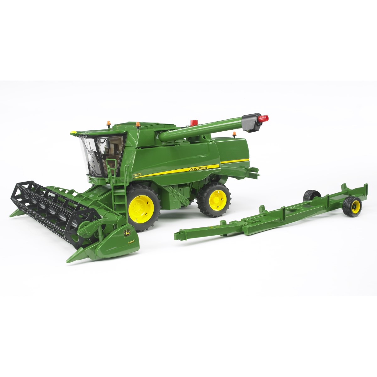 John Deere, der Weltmarktführer bei Traktoren, führt im Produktprogramm auch Mähdrescher. Neu entwickelt wurde bei diesen Erntemaschinen die T-Serie, wobei die Ausführung T 670i das Top-Modell in Leistung und Ausstattung darstellt. Gleiches gilt für das komplett neu entwickelte BRUDER Modell, ein Meilenstein bei der Realisierung technisch anspruchsvollen Spielzeugs. Obwohl die hocheffiziente Technik dieser imposanten Maschinen für den aussenstehenden Betrachter meistens im Verborgenen arbeitet ist es für Kinder immer wieder ein grandioses Schauspiel diesen Mähdreschern beim Ernteeinsatz zu zusehen. BRUDER gelingt es mit dem neuen John Deere Mähdrescher diese Technik erlebbar und begreifbar zu machen. Unsere kleinen Landwirte werden begeistert sein von der einfachen Lenkbarkeit dieses grossen Erntegerätes sowie von der Möglichkeit den Korntank über eine Entleerrohr zu entleeren. Weitere realistische Details wie zu öffnende Kabinentür, zahlreiche zu öffnende Deckel, ein abbaubares, pendelnd aufgehängtes Schneidwerk mit Niveauausgleich - um nur einige zu nennen - garantieren enormen Spielspass.