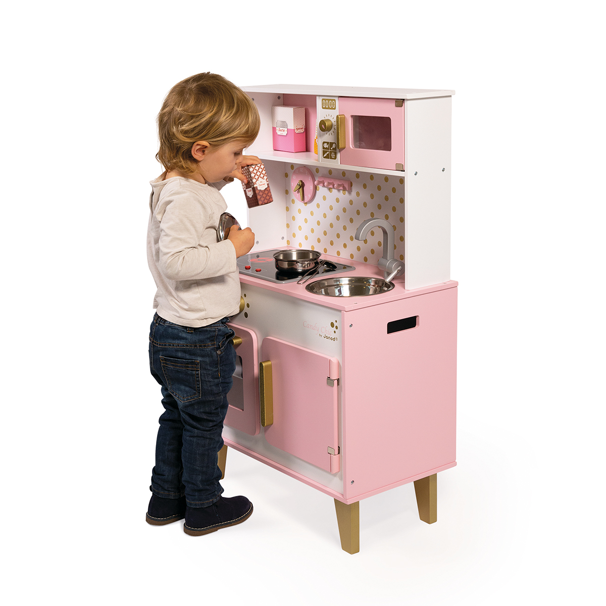 Kommt mit 6 Accessoires und einem LED Induktionskochfeld mit Sound (exkl. Batterien). Die Masse sind: 55x30x87cm
