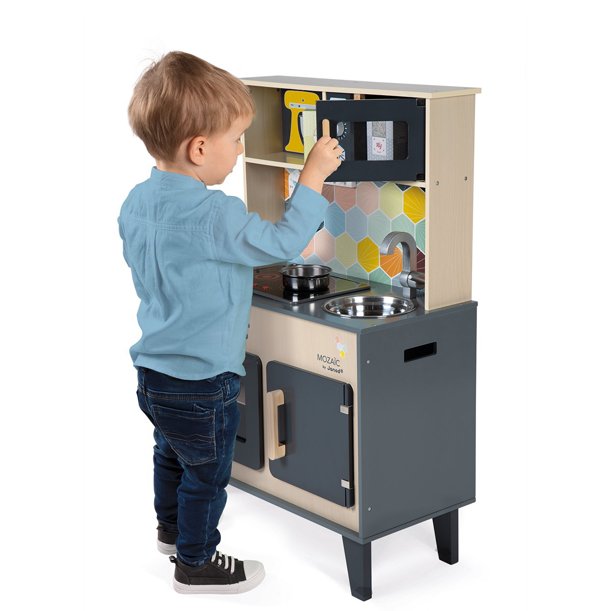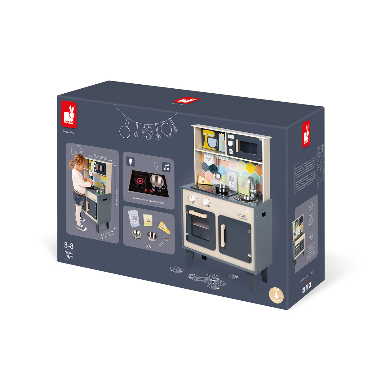 So wie Papa und Mama – bereite leckere kleine Gerichte für deine Freunde vor und werde ein echter Küchenchef!!! Mozaïc-Supergrosse Küche ganz aus Holz mit Hängelement zum Aufhängen von 1 Schaumkelle, 1 Topf und 1 Sieb und 3 Lebensmittelkartons (Käse, Mehl, Reis). Wie eine echte Küche besitzt sie einen Herd mit Geräuscheffekt und LED: Man muss lediglich einmal auf die roten Knöpfe drücken, damit sich die Platten einschalten, dann ein zweites Mal drücken, um das Geräusch von kochendem Wasser zu hören. Das Geräusch und die Kochplatten schalten sich automatisch nach etwa 30 Sekunden aus oder wenn Sie ein drittes Mal die roten Knöpfe drücken. Diese hübsche Küche mit umfangreicher Ausstattung umfasst einen Backofen, eine Mikrowelle, einen Geschirrschrank und einen Kühlschrank mit magnetischen Türen, drei Drehknöpfe mit Geräuschen, eine Edelstahlspüle und eine Uhr. 6 Zubehöre. Höhe der Arbeitsfläche: 50 cm. 2 LR6 - 1,5V alkalische Batterien werden benötigt. Batterien sind nicht im Lieferumfang enthalten. Dim: 55 x 30 x 87 cm.