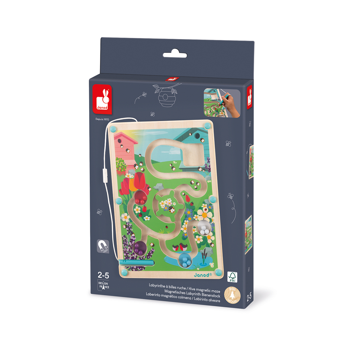 Beginne am Bienenstock und navigiere durch das Labyrinth. Rolle die 12 bunten Kugeln mit dem Magnet-Stift in den entsprechenden Bereich: Blau für den Teich, Rot für die Tulpen usw... Aber passe am Drehkreuz auf, sonst bleibst du stecken!
