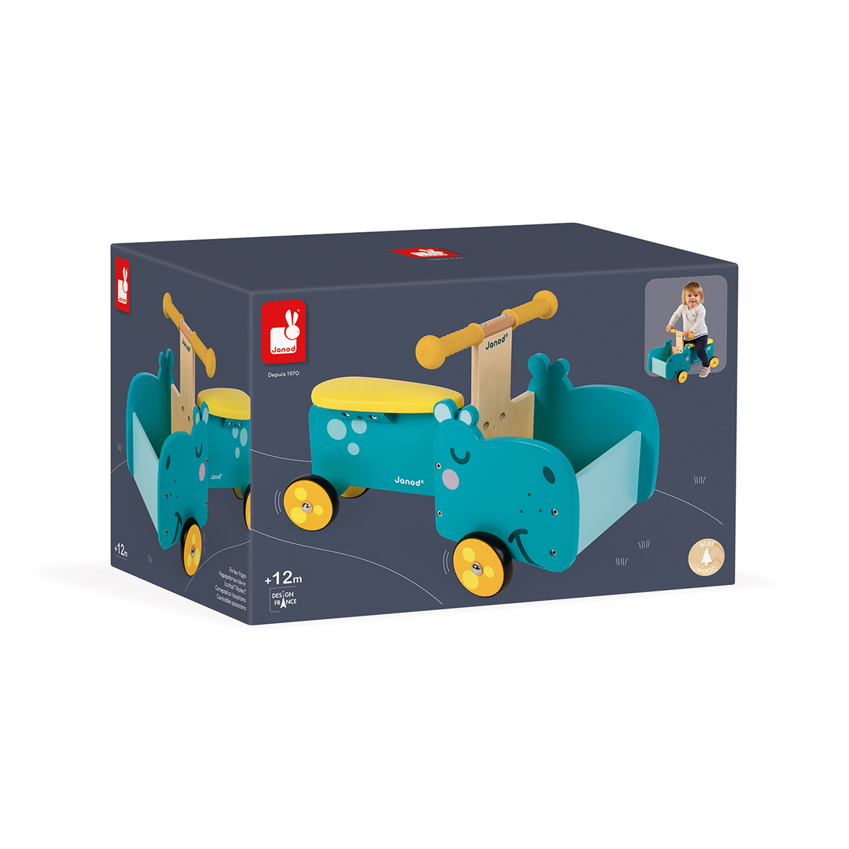 Dank des dafür vorgesehenen Platzes vor dem Lenker des Nilpferdes, kann das Kind seine Spielsachen überall aufbewahren und / oder mitnehmen.