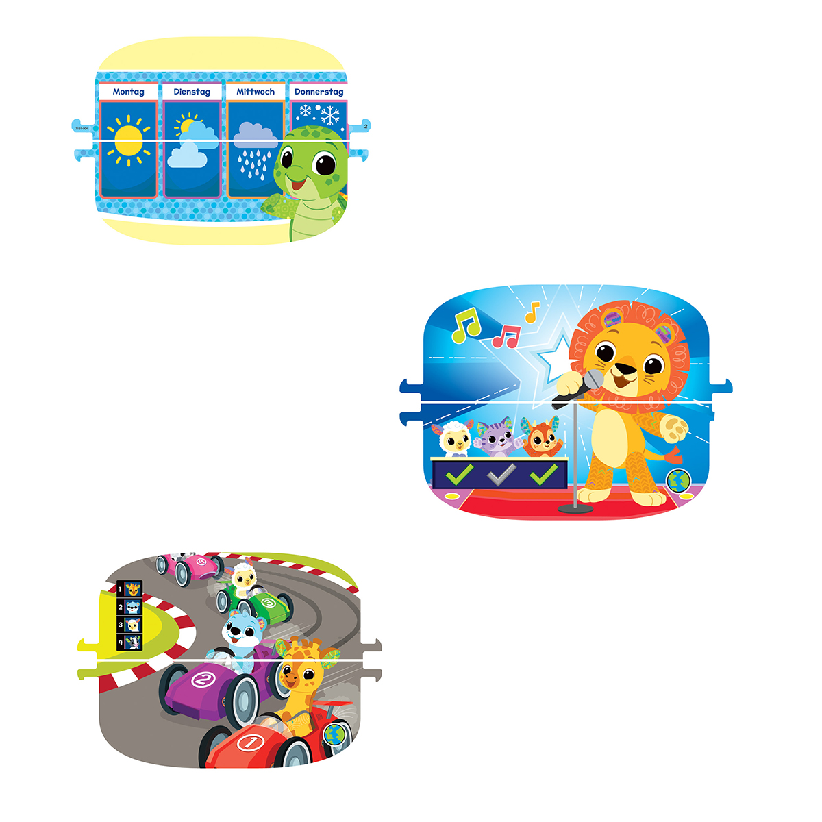 Welchen Kanal schalten wir heute ein? Kindergerechter Spielzeugfernseher mit elektronischer Fernbedienung, mit derer sich das Bild umblättern lässt und der Fernseher dabei passende Audioinhalte abspielt, während verschiedene Lernkanäle ausgewählt werden können. 2 Spielmodi: Fernsehprogramm und Musik. Insgesamt 10 verschiedene Kanäle. Zweisprachiges Fernsehprogramm auswählbar: 4 Kanäle mit Unterhaltungsprogramm: Talentshow, Talkshow, Film und Kochshow. 4 Kanäle mit informativem Programm: Wetterbericht, Nachrichten, Doku und Unterricht. 2 Kanäle mit Sportprogramm: Fußballspiel und Autorennen. Fernsehprogramm kann sowohl mit der Fernbedienung als auch am Fernseher direkt durch Pfeiltasten geändert werden. Die Fernbedienung kann hinter dem Fernseher in der Halterung aufbewahrt werden. 8 gesungene Lieder und 9 Melodien. Kindersicheres Batteriefach und Lautstärkeregler.
