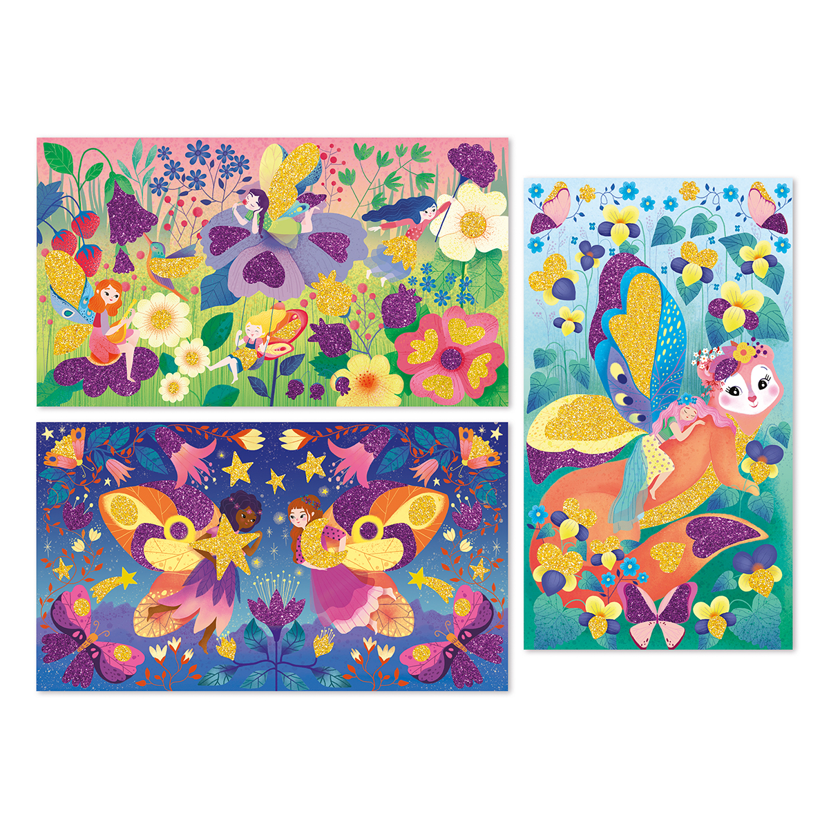 Kleine glänzende Feen! Mit diesem Kreativset können Sie 3 Gemälde in einem magischen Grafikuniversum mit Glitter verzieren! Es enthält 3 Diagramme, 2 Tuben mit biologisch abbaubarem Glitzer (lila und gold) und 1 Broschüre mit Schritt-für-Schritt-Anleitungen und Vorlagen. Diese Aktivität fördert die Entwicklung von Geduld und Kreativität und erfordert etwa 30 Minuten pro Gemälde. Es ist ideal für Kinder ab 5 Jahren.