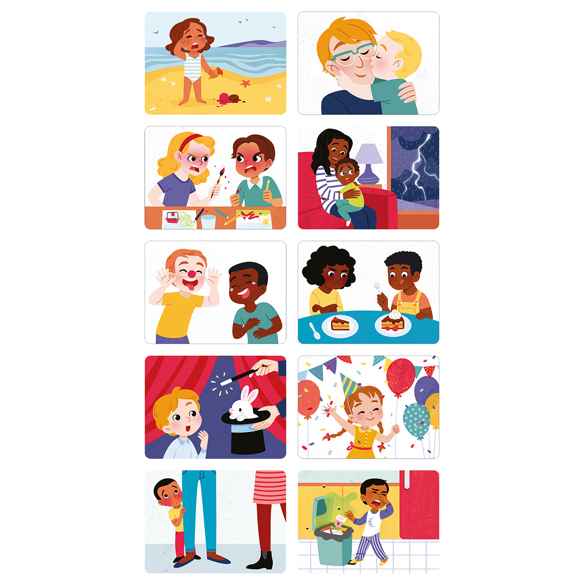 Enthält 1 Holzplatte, 27 grosse Magnete und 20 Karten mit verschiedenen Situationen. Mit einem von Psychomotorikern entwickeltem Leitfaden für Emotionen. Lassen Sie Ihr Kind die Emotionen mithilfe der bebilderten Karten entdecken. Auf jeder Karte ist eine andere Alltagssituation dargestellt. Auf der Rückseite jeder Karte ist ein „Reaktionsgesicht“, das einem der Magneten entspricht. Mit den Magneten wird das Gesicht passend zu dieser Emotion gebildet. 2 Spielstufen: Nachbilden eines einfachen Gesichtsausdrucks auf der Rückseite der Karte oder, für die Grösseren, Erraten der Emotion zu jeder der Situationen. Auf dem Boden des Kastens ist ein Spiegel, damit das Kind üben kann, die verschiedenen Emotionen nachzumachen und zu identifizieren. 10 Emotionen zum Entdecken: Freude, Angst, Traurigkeit, Wut, Verlegenheit/Schüchternheit, Liebe, Ekel, Lachen, Neid, Überraschung.