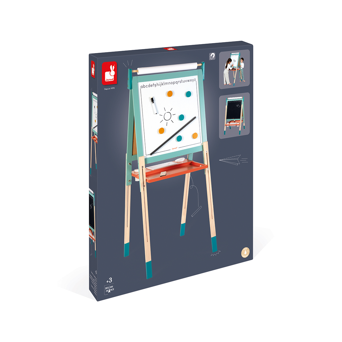 Auf geht‘s zur Schule mit der 4-in-1 Tafel! 4 Aktivitäten sind in diesem hübschen Koffer enthalten: - eine magische Tafel mit einem Stift. Man muss nur den Griff von links nach rechts schieben und die Zeichnung wird wie von Zauberhand gelöscht! - ein magnetisches Whiteboard mit 42 Magneten (27 Buchstaben, 10 Zahlen und 5 Zeichen) zum Erlernen des Alphabets und der ersten Rechenaufgaben - eine schwarze Schiefertafel mit einer Schachtel Kreiden und einer Bürste - ein Whiteboard zum Schreiben mit einem abwischbaren Filzstift (nicht im Lieferumfang enthalten). Praktisch: Dank des Baumwollgriffs kann Ihr Kind die Tafel überallhin mitnehmen. Ihr Kind kann seine Vorstellungskraft entfalten und schreiben lernen. Spielzeug aus FSCTM-zertifiziertem Holz für Kinder ab 3 Jahren.