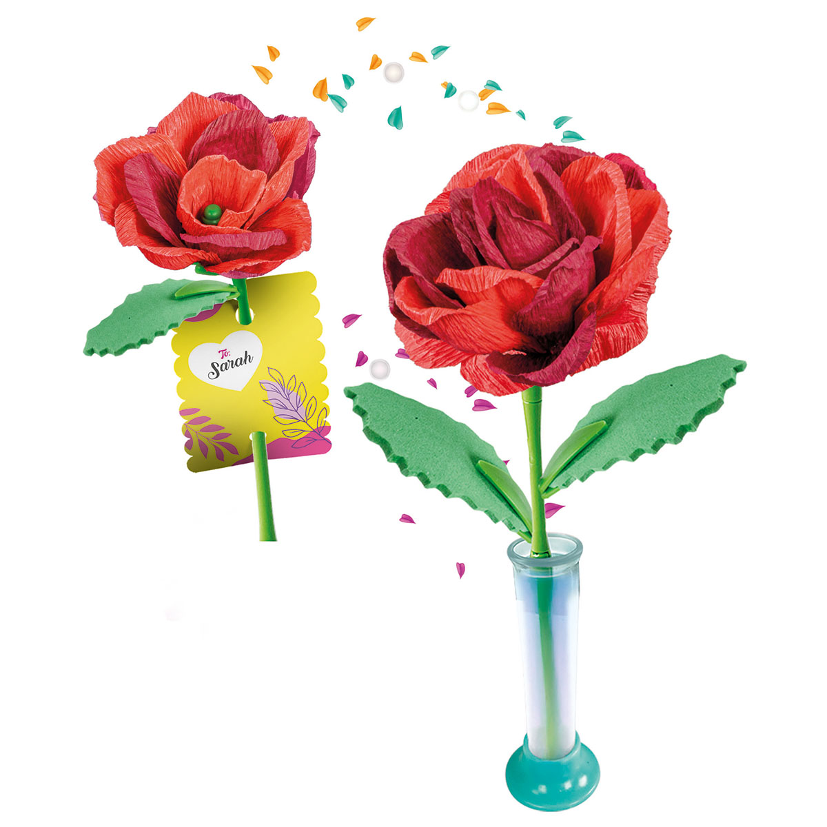 Eine originelle Kreation um 2 Rosen zusammenzustellen und sie mit verschiedenen Farben zu personalisieren. Ein praktisches und reichhaltig sortiertes Set mit Stielen, Blütenblättern zum Färben, Blumenkronen zum Zusammenstellen und dem Blumenhalter zum Zusammensetzen und Dekorieren. Ab 7 Jahren.