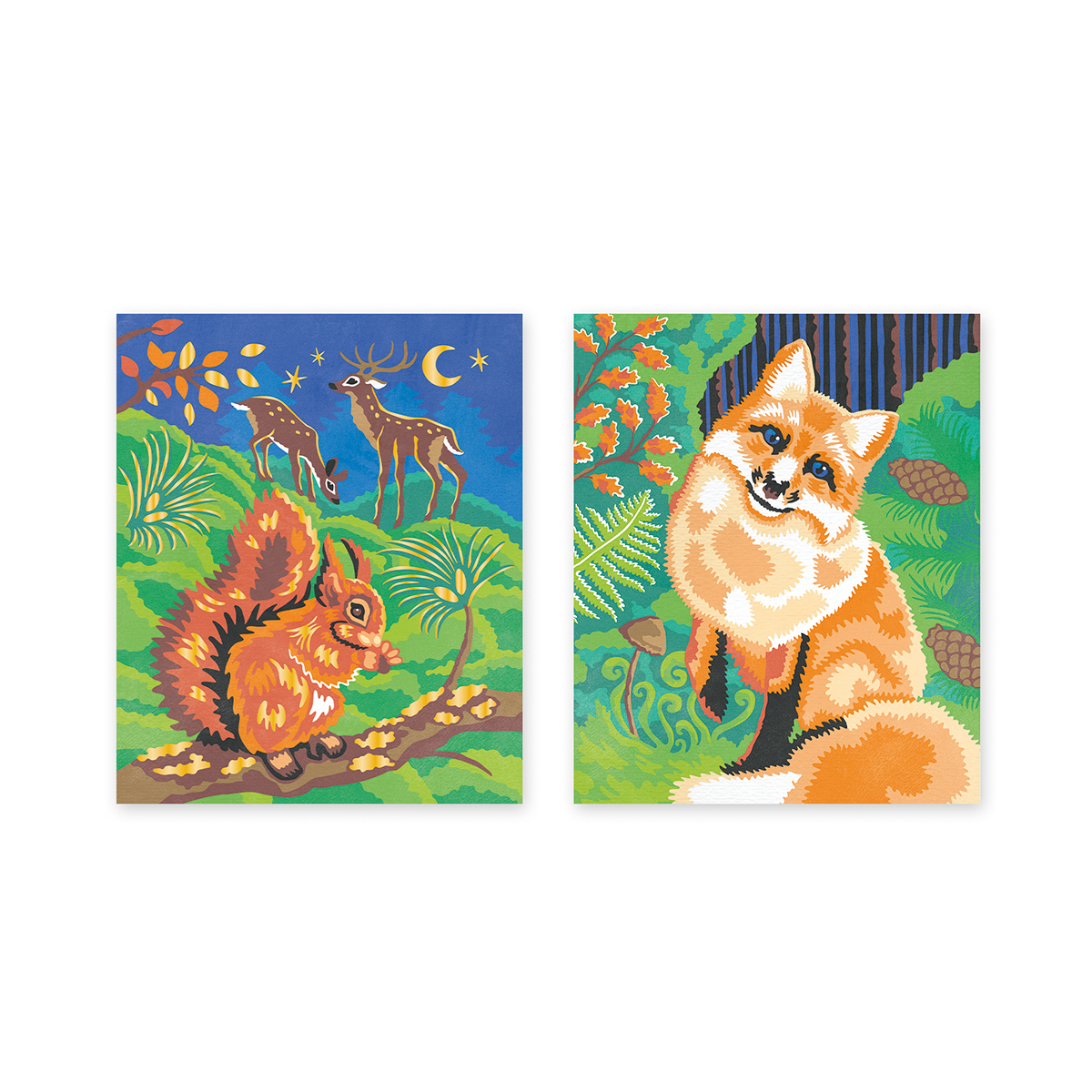 Der Wald hält viele Überraschungen für Sie bereit! Mit diesem Kreativ-Set können 2 Bilder mit der Malen-nach-Zahlen-Technik anfertigt werden. Das Ergebnis sind ein schöner Fuchs und ein kleines Eichhörnchen in ihrer natürlichen Umgebung. Es enthält zudem einen Rahmen, der bemalt und individuell gestaltet werden kann, damit er zu den Bildern passt. Eine Palette mit 15 Aquarellfarben, ein Schwamm und ein Pinsel mit Wassertank vervollständigen dieses Set und ermöglichen eine originelle Aktivität. Ein Anleitungsheft zeigt, welche Farbe welcher Zahl entspricht. Eines der beiden Bilder ist mit Vergoldungseffekten versehen, um ein noch spektakuläreres Ergebnis zu erzielen. Diese Aktivität unterstützt die Entwicklung von Feinmotorik und Geduld und dauert etwa 6 Stunden. Ideal für Kinder ab 7 Jahren.