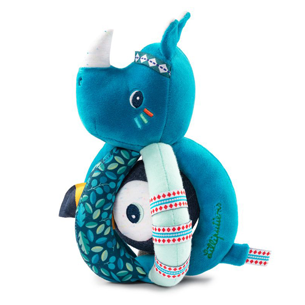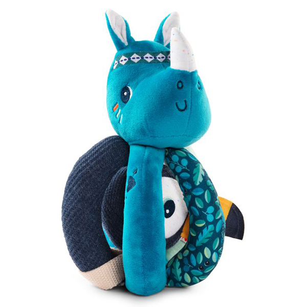 Eine originelle Rassel, für kleine Händchen einfach festzunehmen. Zwischen den Handgriffen versteckt sich ein kleiner Freund. 100% Polyester. Maschinenwaschbar bei 30°C - Schonwaschgang.