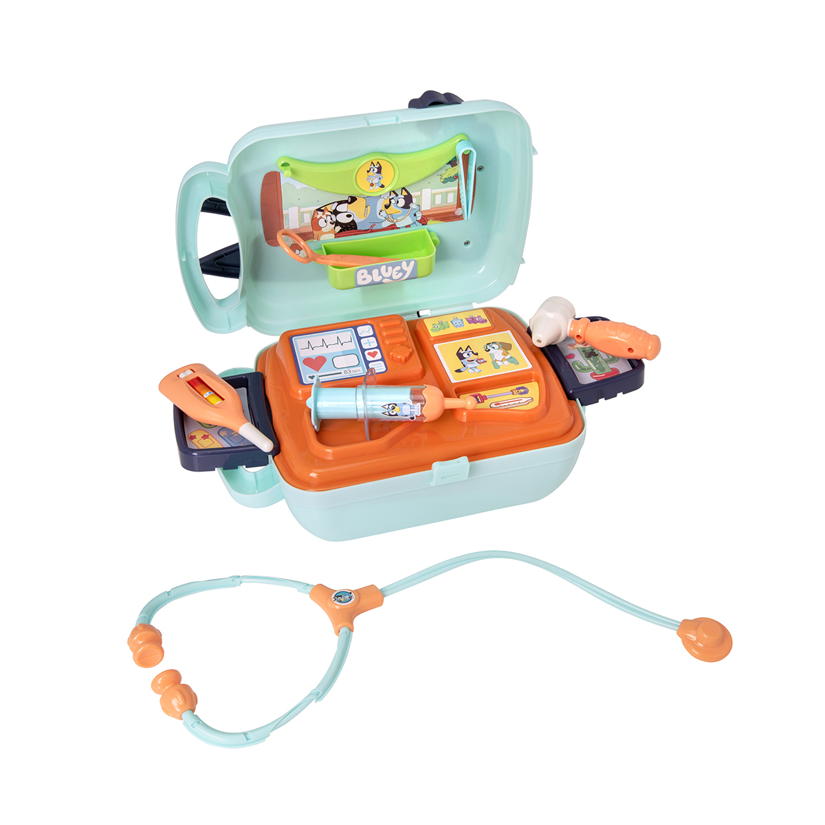 Diese lustig geformte Tragetasche enthält alles, was Sie brauchen, um wie ein echter Sanitäter zu spielen. Der Inhalt umfasst ein Spielzeug-Stethoskop, ein Thermometer, ein Otoskop, eine Spritze, Pflaster, eine Schere, einen Spiegel, eine Pinzette und eine Medikamentenflasche. Dieses Spielzeug fördert fantasievolles Rollenspiel und soziale Interaktion.