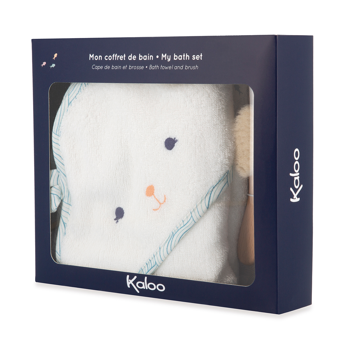 Ein entzückendes Badeset, das speziell für das Wohlbefinden des Babys entwickelt wurde. Es umfasst ein 75 cm grosses Babybadetuch aus Bambus (Grammatur 500 g) mit einem Bärenkopf und einer Haarbürste. Das Bambusmaterial wurde speziell wegen seiner antibakteriellen und saugfähigen Eigenschaften ausgewählt, während es gleichzeitig sehr weich ist. Verschiedene Details veredeln das Babybadetuch: Wellenmuster am Rand und hübsche gestickte Fische auf der Rückseite. Perfekt für Babys erstes Bad und um es warmzuhalten. Die weiche Massagebürste aus Buchenholz und Ziegenhaar vervollständigt dieses Set, um das Baby in ruhigen Momenten zu entspannen. Kleine Fische, die das Muster des Badetuchs aufgreifen, wurden per Siebdruck auf die Bürste gedruckt. Stoff bei 30 °C in der Maschine waschbar. Ab Geburt.