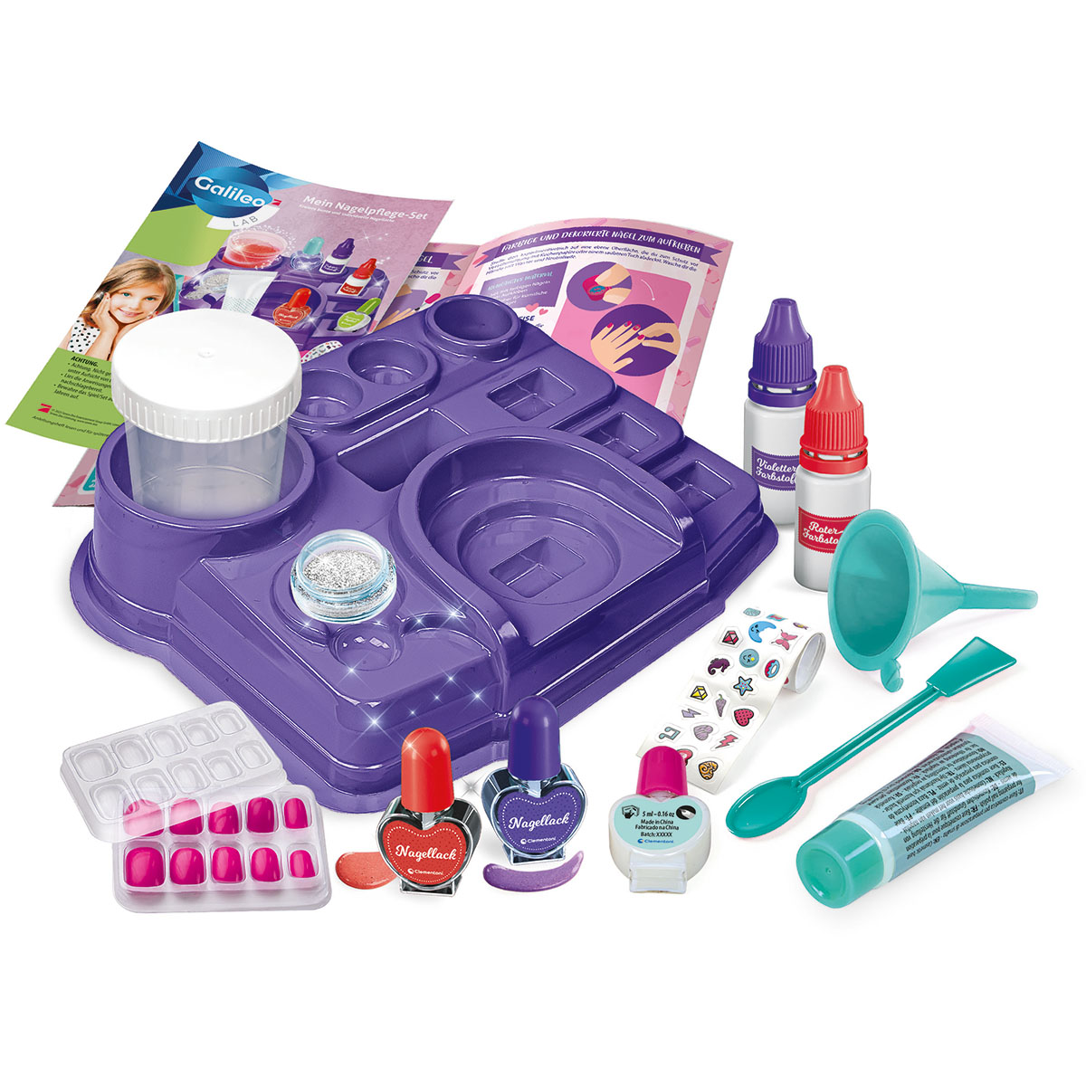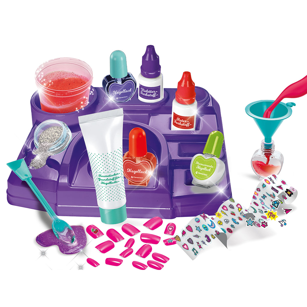 Mein Nagelpflege Labor. Ein lustiges und kreatives wissenschaftliches Set, das Kinder in alle Geheimnisse der Nagelpflege und Nagelkunst einweiht. Die praktische Arbeitsstation ermöglicht es den Kindern, die Basis mit den im Set enthaltenen Farbstoffen zu mischen und leuchtende Lacke zu kreieren. Aufkleber und Glitter sind eine wunderbare Ergänzung, mit der fantasievolle Fashionistas ihrer Kreativität freien Lauf lassen können!