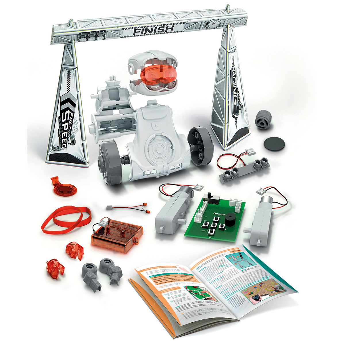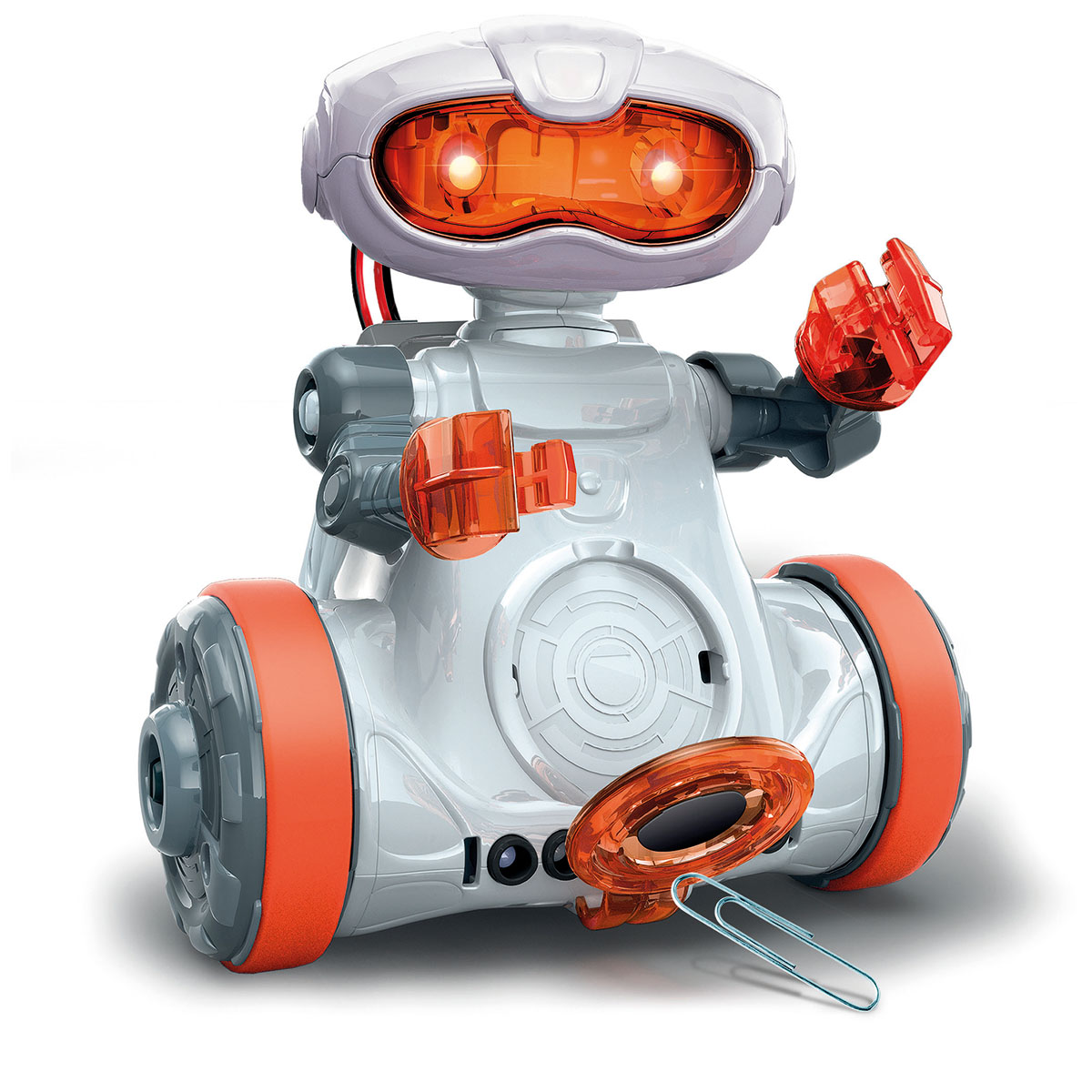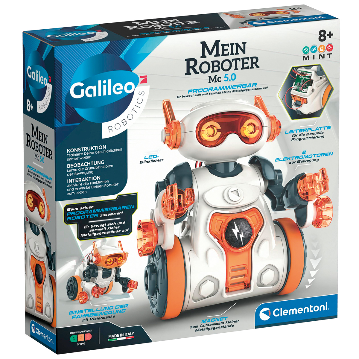 Mein Roboter mc 5.0 D. Ein einzigartiger und origineller Roboter zum Zusammenbauen, mit vielen unterhaltsamen Spielmodi! Dank zweier Infrarotsensoren kann der neue Roboter Hindernissen ausweichen und deiner Hand wie ein echter Bluthund folgen. Du kannst das Mikrofon verwenden, um ihn zu steuern, indem du einfach in die Hände klatschst. Über die Drucktaste am Rücken des Roboters kannst du seine Route programmieren. Die kostenlose App verfügt über zwei Spielabschnitte: Codierung, um die Prinzipien der blockbasierten Programmierung zu erlernen, und Echtzeit, um Bewegungen, Geräusche und Lichteffekte so zu steuern, als ob du eine echte Fernbedienung verwenden würdest. Zuletzt kannst du den Roboter mit dem Markerhalter bzw. dem Magnethalter zeichnen lassen oder ihn so programmieren, dass er nach kleinen Münzen und Büroklammern sucht.