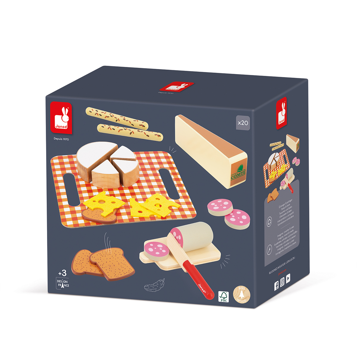 Brotzeit! Erleben Sie mit Ihrem Kind einen geselligen Moment mit diesem tollen Set, mit dem es perfekt die Grossen imitieren kann. Mithilfe seines Schneidbretts kann Ihr Kind Ihnen die verschiedenen Käse vorstellen: Camembert, Emmentaler, Comté… Und dazu gibt es Vollkorn-Kastenbrot oder Grissini, je nach persönlichem Geschmack. Und natürlich Wurst, die mit dem Messer von Janod einfach zu schneiden ist! Spielzeug aus Holz und Karton. Rollenspielzeug für Kinder ab 3 Jahren.
