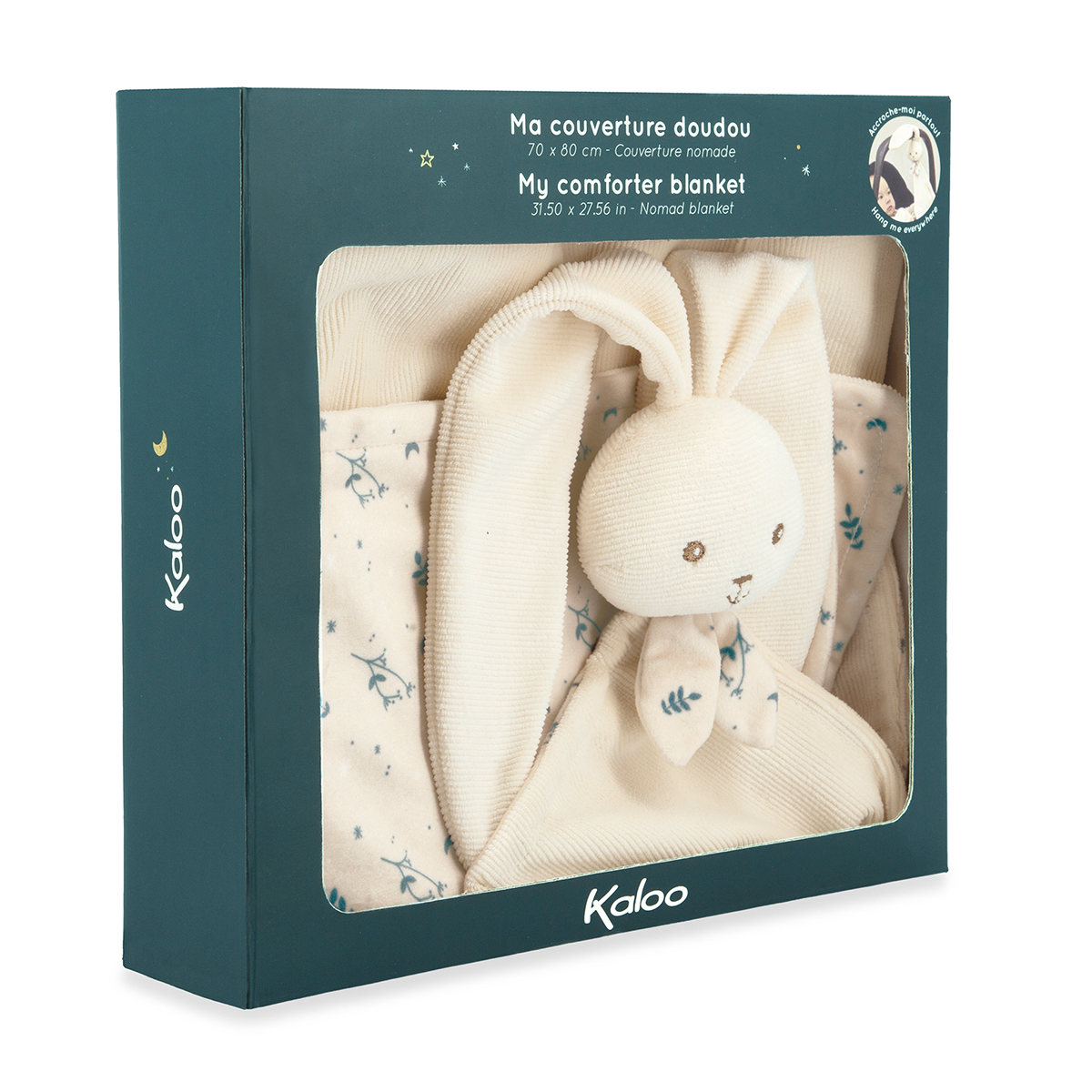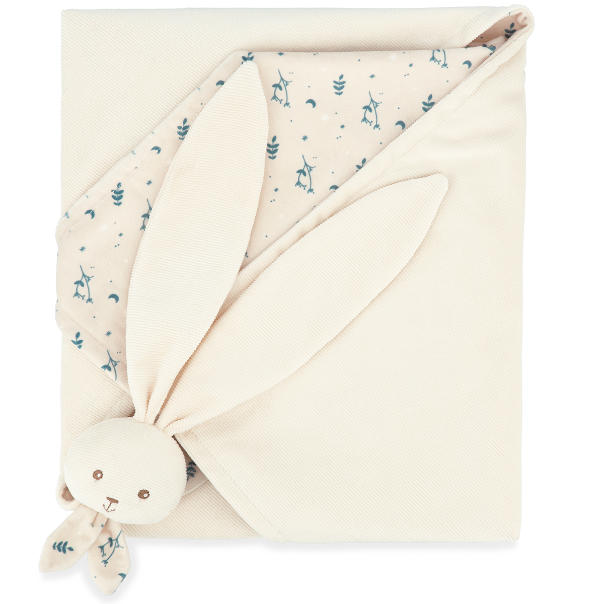 Schenken Sie Baby mit dieser cremefarbenen Kuscheldecke Weichheit und Trost. Sie ist mit einem Hasenkopf mit langen Ohren versehen, damit man sie überall aufhängen kann und nie verliert. Die herrlich weichen Stoffe aus Microvelours und Cordsamt machen diese Decke so kuschelig wie eine Umarmung. Die Motive auf einer Seite verleihen der Kuscheldecke einen raffinierten Touch. Sie besteht zu mindestens 90 % aus recycelten Materialien und recyceltem Füllmaterial, was sie zum idealen Geburtsgeschenk für Ihre Lieben macht. 70 x 80 cm. Bei 30 °C in der Maschine waschbar. Ab Geburt.