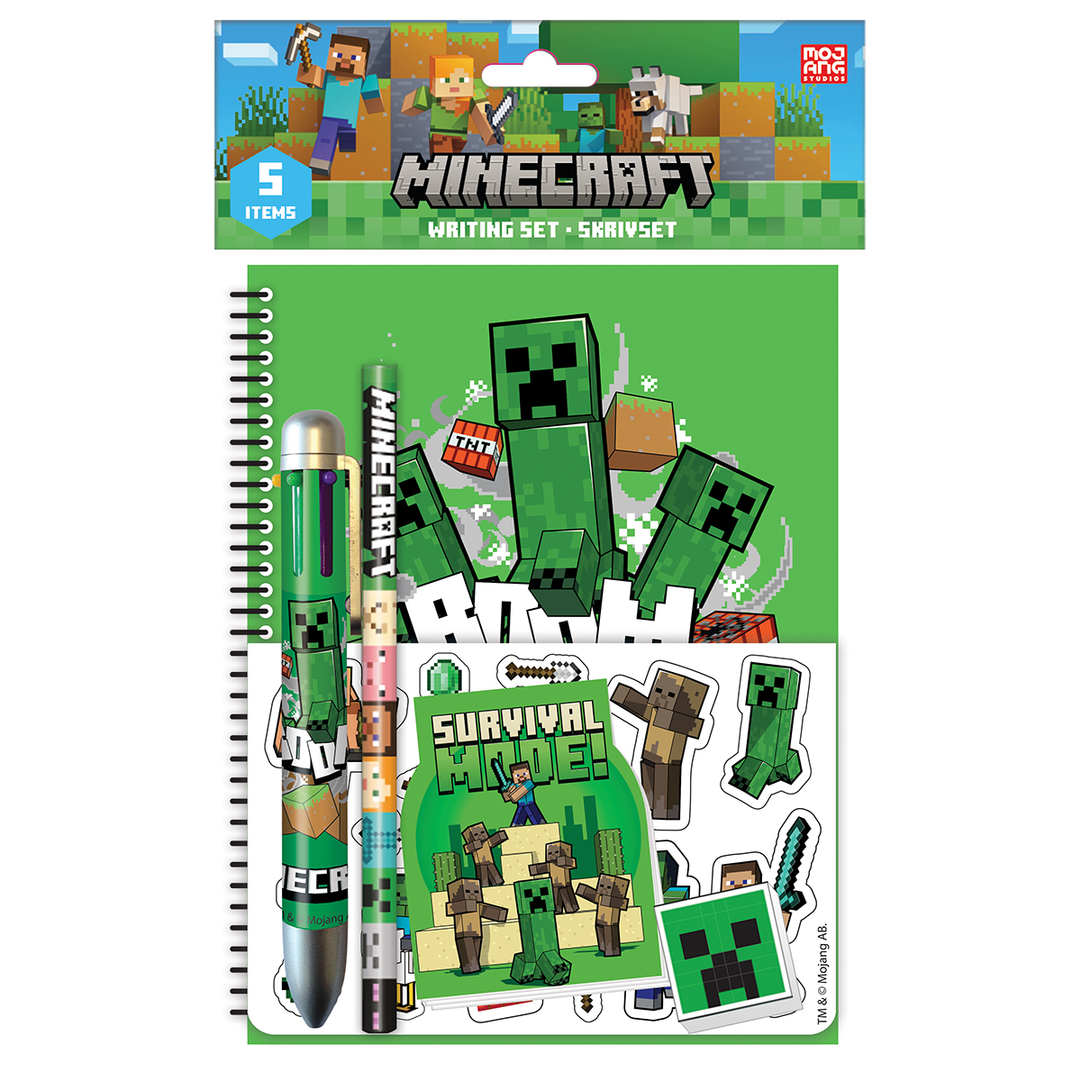 Schreibwarenset mit Etui, Notizbuch, Kugelschreiber, Radiergummi, Lineal 15 cm, Spitzer und 5 Buntstiften.