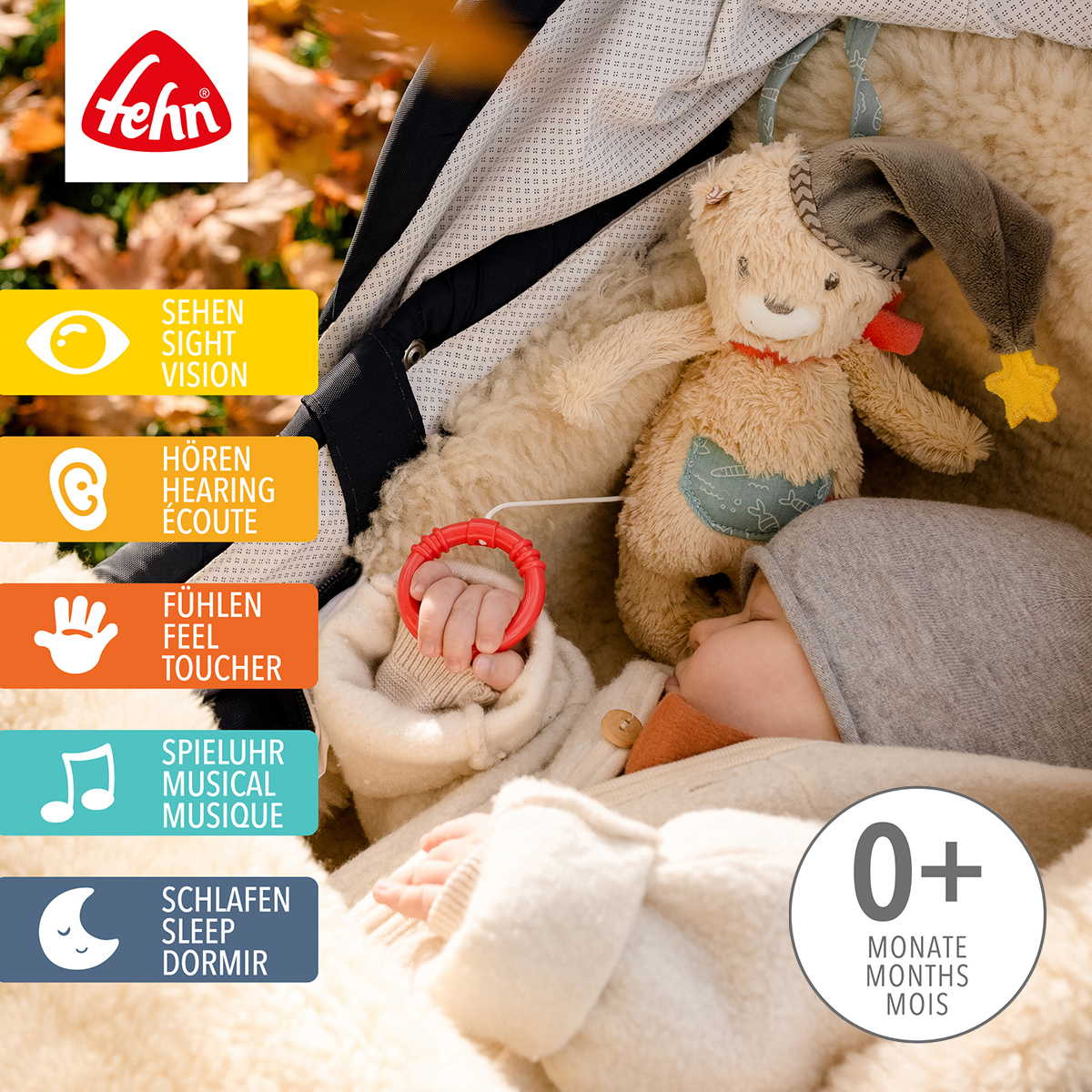 Die Spieluhr Bär ist sehr flauschig und eignet sich super zum Fühlen, Kuscheln und Liebhaben. Zieh die Spieluhr auf um einen Schlafsong zu hören.