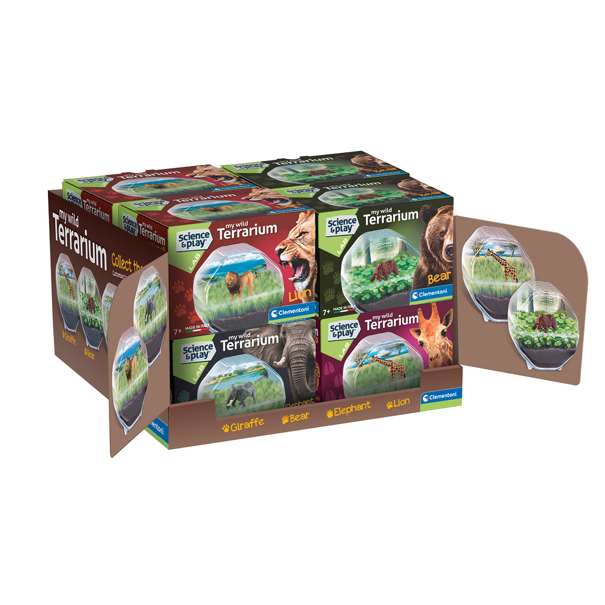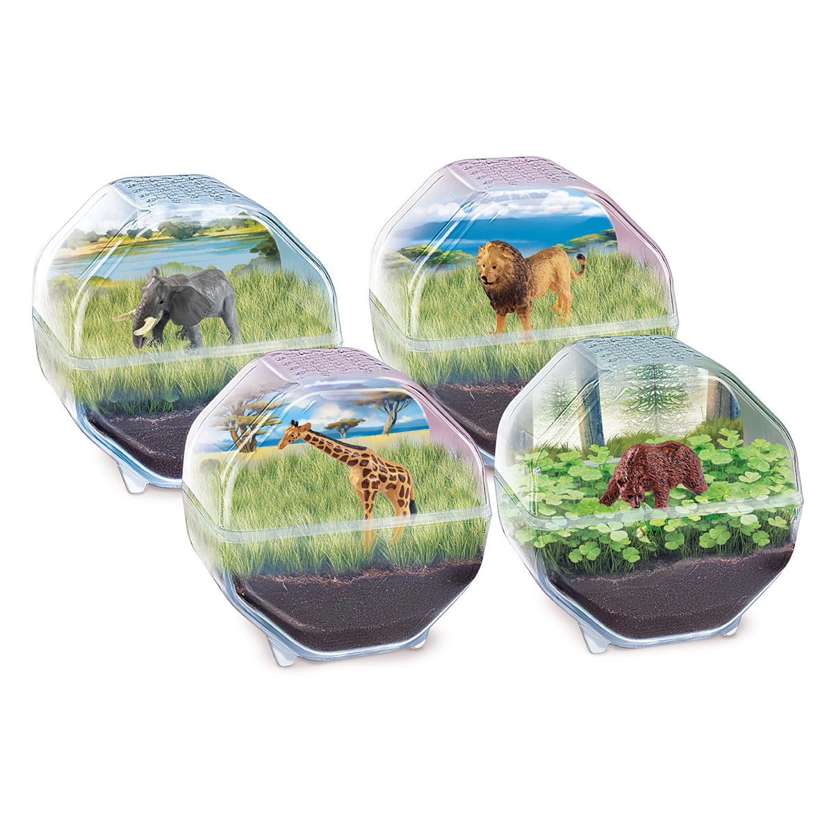 Mini Terrarium assortiert im Display, Löwe, Bär, Giraffe, Elefant. Erstelle und pflege vier Mini-Lebensräume mit Tiermodellen, Pflanzen zum Züchten und realistischen Details zum Zusammenbauen. Trainiere Geduld, Aufmerksamkeit und Sorgtfalt, indem du mit der Natur spielst. Sammle alle Sets. Jedes Terrarium ist eine kleine Welt die es zu gestalten gilt.