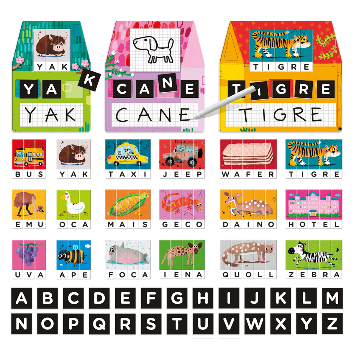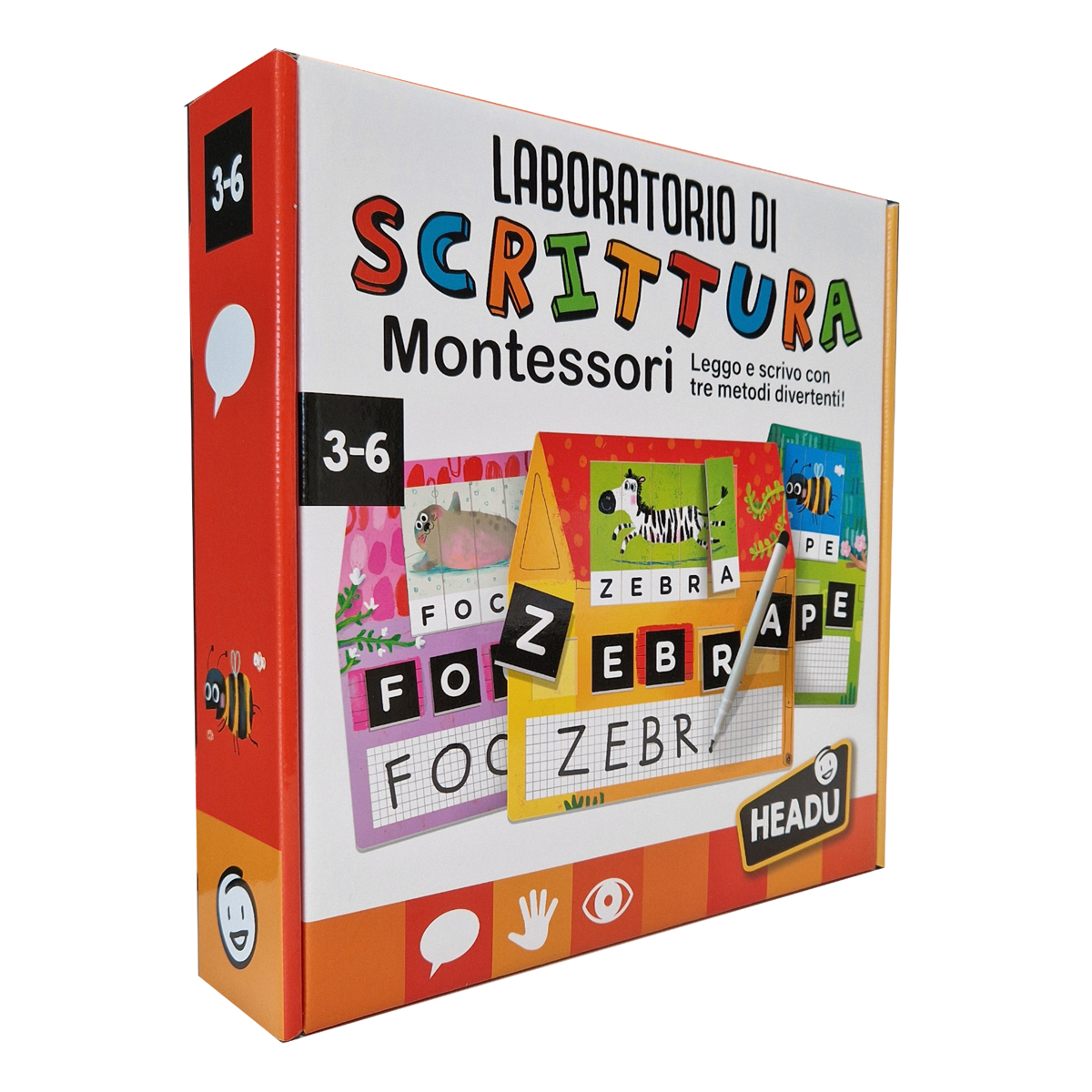 HEADU ITALIENISCH: Laboratorio di Scrittura Montessori, Età: 3-6. Leggo e scrivo con tre metodi divertenti! Con le speciali casette, i bambini ricompongono i puzzle delle parole, scrivono con le letterine mobili e si allenano con la scrittura libera grazie al pennarello in dotazione. Il gioco, ispirato al metodo Montessori dei tre tempi, rafforza l'apprendimento della lettura e della scrittura in modo coinvolgente!