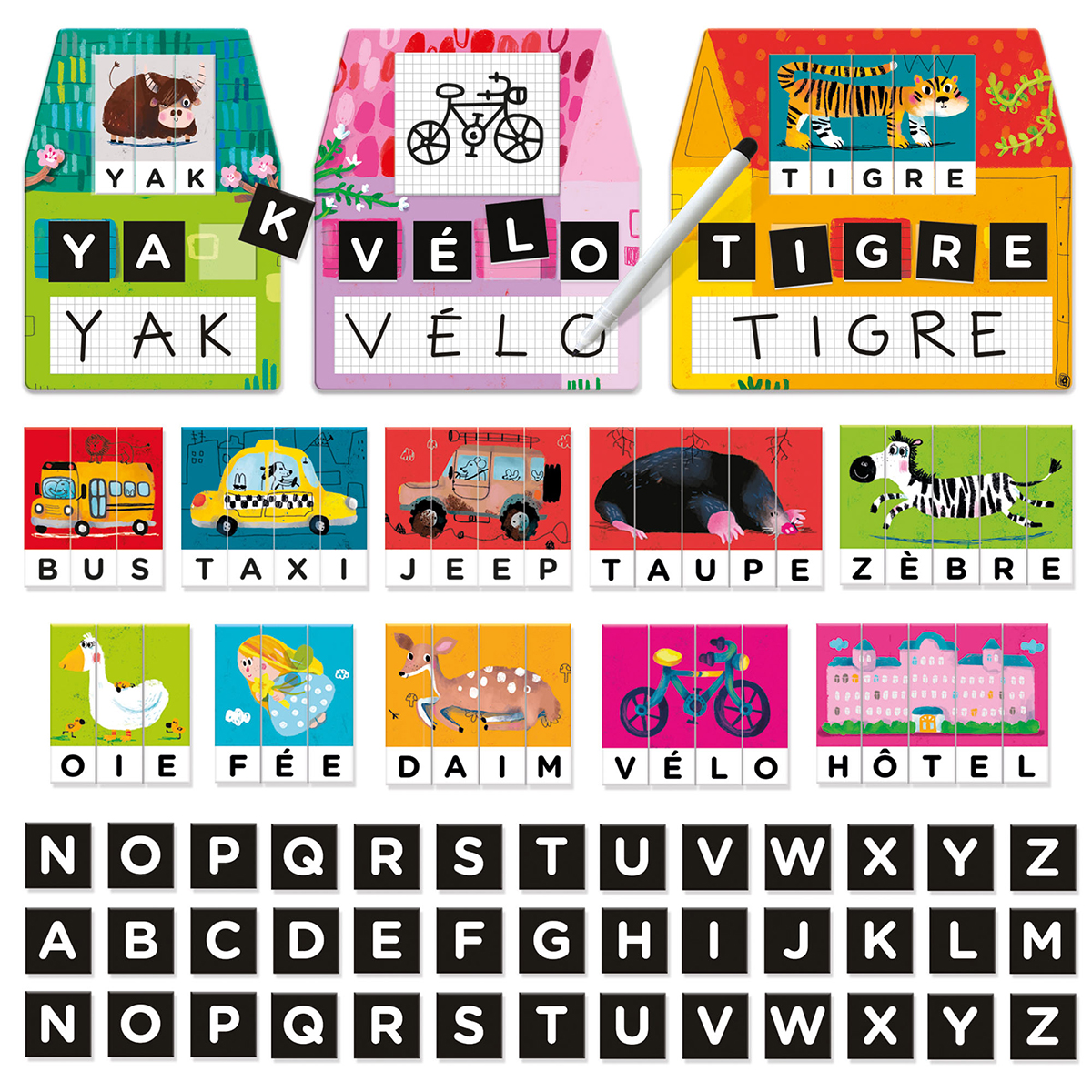 Mon Labo d'écriture Montessori - Âge: 3-6. Trois méthodes amusantes pour lire et écrire. Avec l’aide des petits pupitres en forme de maison, les enfants assemblent les puzzles des mots, écrivent avec les lettres prédécoupées et exercent l’écriture manuelle avec le feutre fourni dans le kit. Un jeu pour renforcer l’apprentissage de la lecture et de l’écriture. Acquisition des premières étapes de l’écriture et de la lecture.