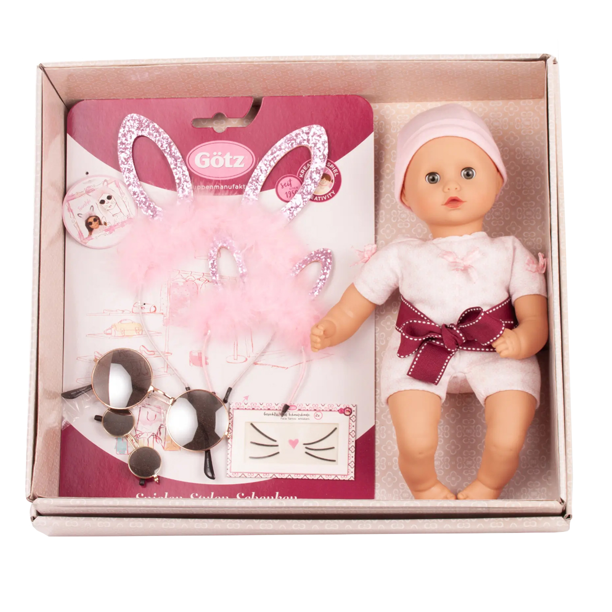Dieses hochwertige Oster-Geschenkset Muffin Happy Easter bietet stilvolle Details und sorgfältige Verarbeitung in einer edlen Geschenkbox. Sie schenken ein abgestimmtes Set aus Muffin-to-Dress mit passender Mütze, glitzerndem Osterhasen-Haarreif sowie Nickelbrillen – jeweils für Kind und Puppe. Ergänzt durch liebevoll gestaltete Gesichtstattoos entsteht ein besonderes Set für gemeinsames Spiel und Freude. Eine durchdachte Geschenkidee für alle, die Qualität, Ästhetik und Wertschätzung verschenken möchten. Die Muffin-Puppen haben einen weichen Stoffkörper, gefüllt mit flauschiger Watte und Granulat. Ihre Arme und Beine sind aus Vinyl. Die Puppe ist waschmaschinen- und trocknergeeignet und somit leicht zu reinigen – perfekt für den täglichen Spielspaß. Inhalt: Muffin, Mütze, Haarreifen für Kind & Puppe, Nickelbrille für Kind & Puppe, Gesichtstattoos