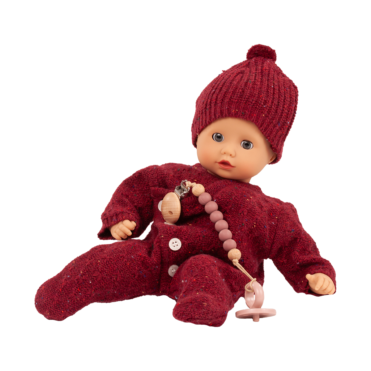 Eine wunderschöne Puppe zum 75. Jubiläum. Die Muffin trägt einen eleganten bordeauxroten Strick-Overall mit schicken Knöpfen und einer passenden Mütze. Abgerundet wird ihr Look mit einer süßen Schnullerkette und einem Schnuller. Diese Jubiläumsedition ist etwas wirklich ganz Besonderes und perfekt für kleine Puppenliebhaber. Ein unvergessliches Geschenk, nicht nur für besondere Anlässe. Bestehend aus: Strickanzug, Mütze, Schnullerkette, Schnuller, waschmaschinen- & trocknergeeignet