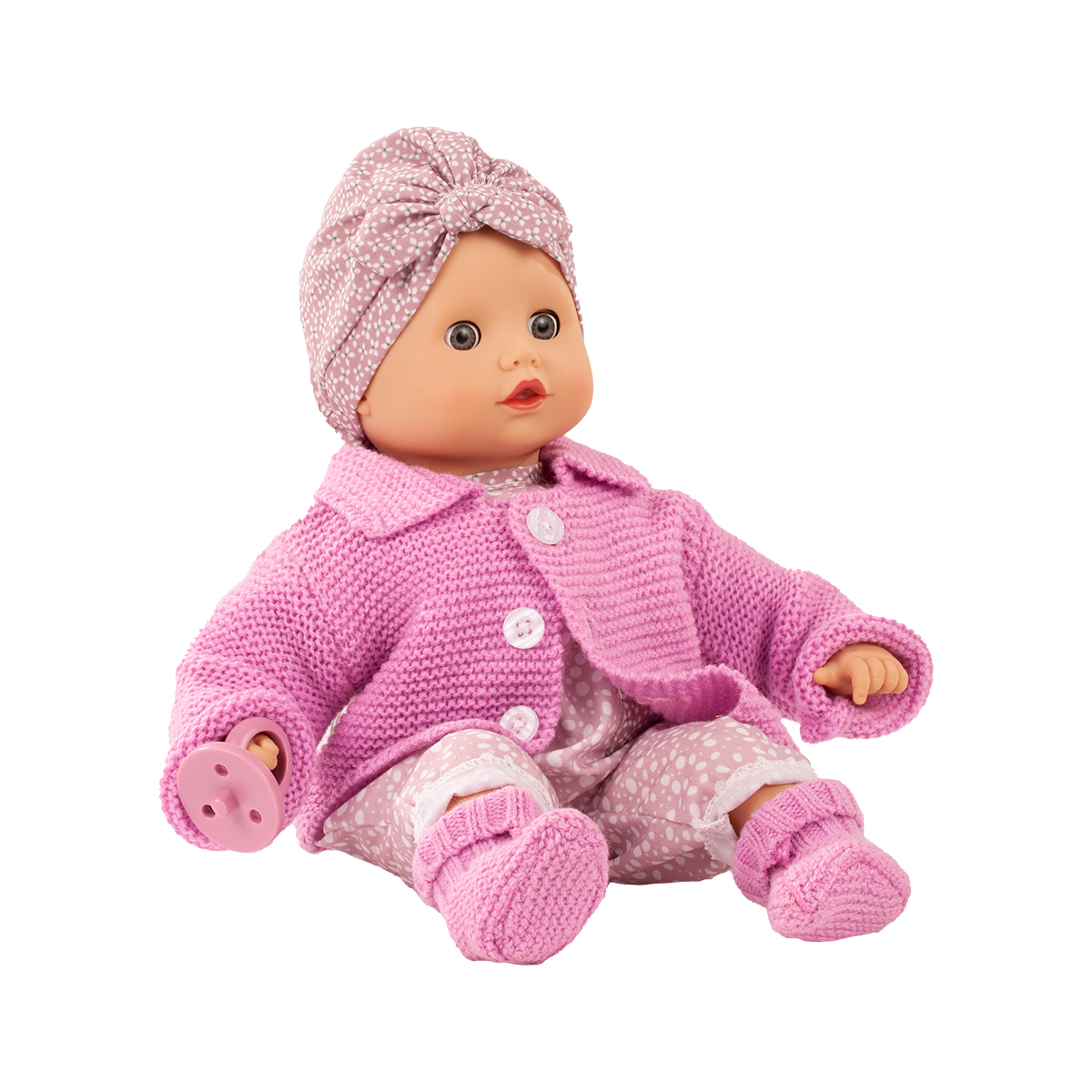 Götz Puppe Muffin ohne Haare und mit Schnuller. Diese Puppe ist ein wahrer Spielgefährte. Sein weicher Stoffkörper ist mit flauschiger Watte und feinem Granulat gefüllt, mit Schlafaugen. Die Bekleidung ist von Kindern leicht aus-und wieder anzuziehen.