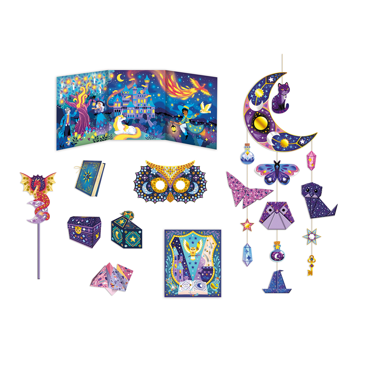 Bist du bereit für etwas Magie? Mit dieser Multiaktivitätsbox können 1 dreiteiliges Sandbild, 1 Maske, 1 Zauberstab und 1 Zauberwappen mit selbstklebenden Schaumstoff-Mosaiken, 1 goldener Traumfänger mit Origamis, 3 Papierschalen mit Stickern zum Verschönern, 2 kleine Truhen und 1 Zauberbuch gestaltet werden. Sie enthält 2 Röhrchen Sand, 4 Metallic-Bogen, 5 Bogen mit selbstklebenden Schaumstoff-Mosaiken, Goldfaden, 1 Gummiband, 1 Bogen Sticker, 6 Origami-Blätter, 1 Holzstift, 3 Blätter für die Schalen, 3 selbstklebende Bilder, 3 vorgestanzte Bogen, 1 Maske, 1 Blatt und 1 Heft mit Anleitungen und Vorlagen. Diese Aktivität fördert Geduld und Kreativität und dauert je nach Aktivität ungefähr 15 Minuten bis 1,5 Stunden. Sie ist ideal für Kinder ab 7 Jahren.