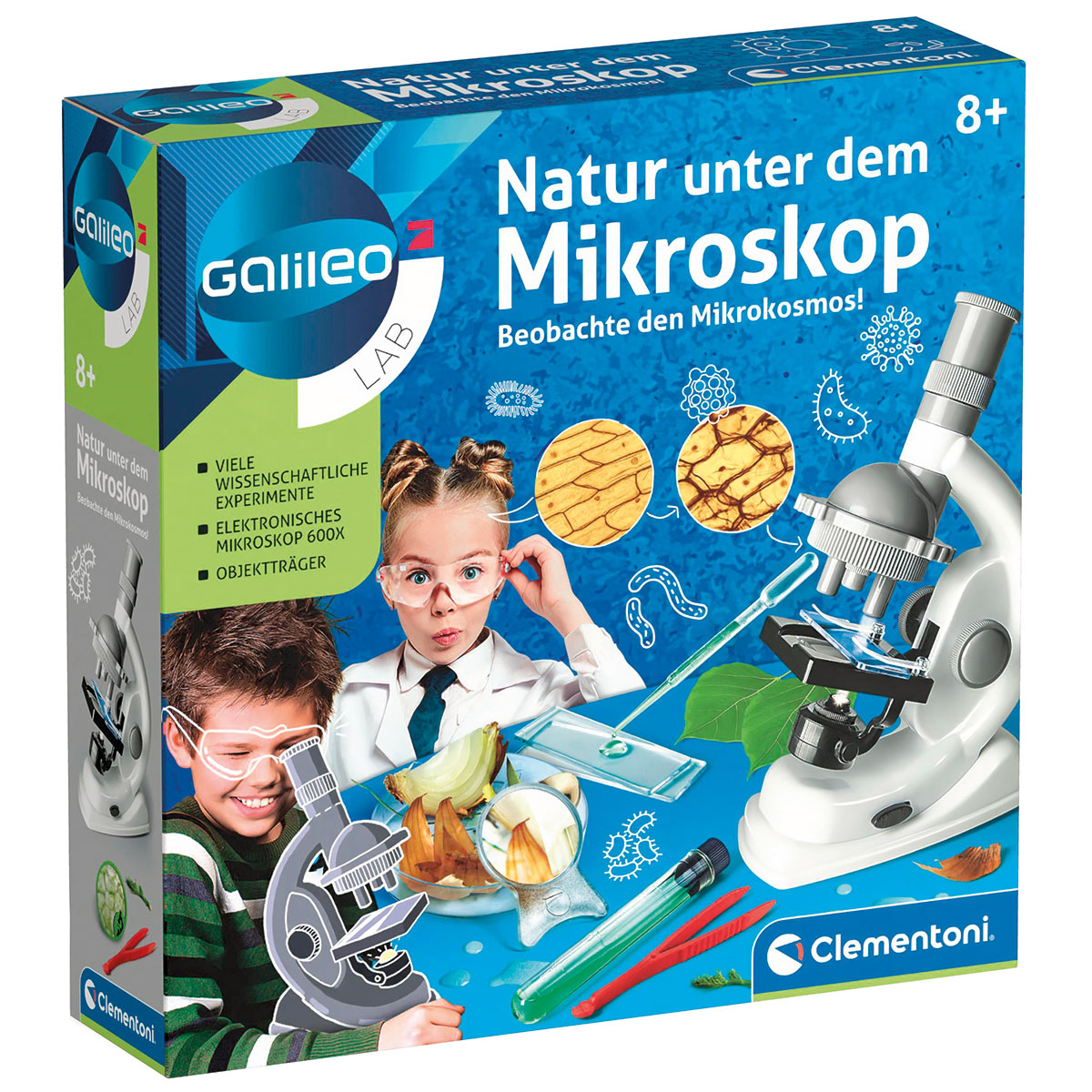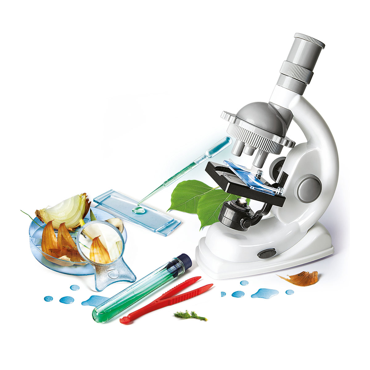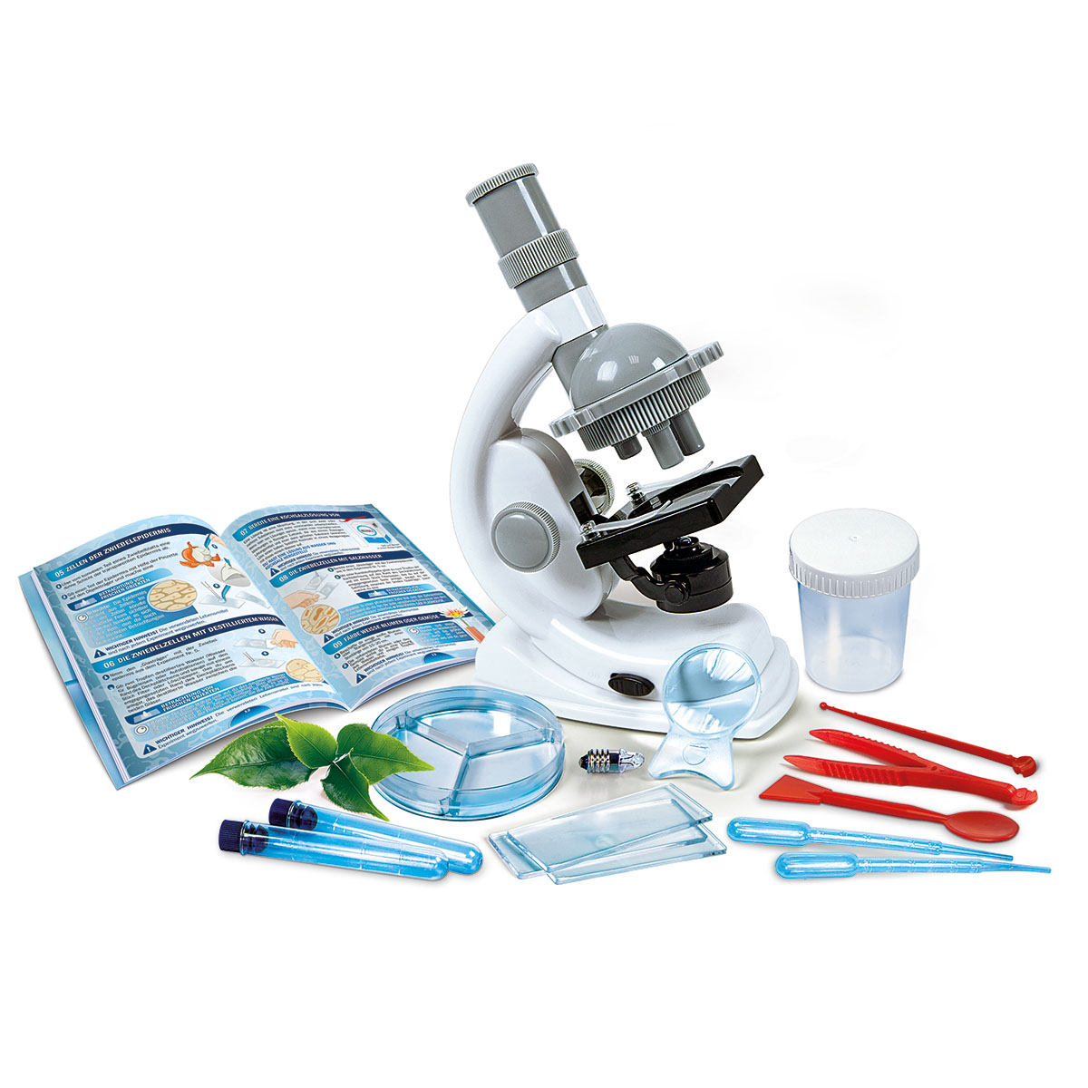 Ein fantastisches, mikrobiologisches Labor, reich an Instrumenten und Ausrüstungen, um den uns umgebenden Mikrokosmos mit Hilfe des Präzisionsmikroskops zu erforschen. Mehr als 90 Experimente mit speziellen Aufgaben und Tests. Enthält eine Vielzahl an Instrumenten: Objektträger aus Kunststoff, Reagenzgläser, Pipetten und Messbecher.