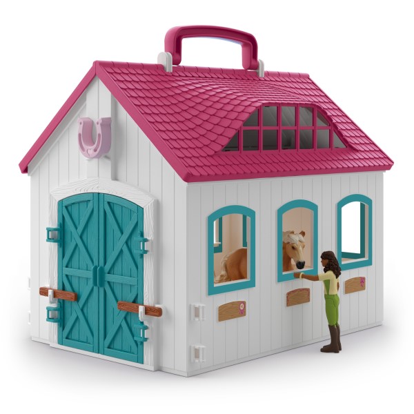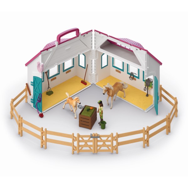 Auf Lakeside wurde angebaut! Im neuen Offenstall können sich die Pferde frei bewegen und sind an der frischen Luft! Sarah füttert gerade die Haflinger Stute und ihr Fohlen. Der Stall kann zu einem Koffer zusammengeklappt werden und bietet im geschlossenen Zustand Platz für bis zu sechs Pferde. Die Kleinteile können sicher in dem Extrafach unter dem Dach verstaut werden. Optimal für unterwegs! Danach möchte sie das Fohlen behutsam an den Führstrick gewöhnen. Der grosse Paddock eignet sich dafür perfekt! Es ist genügend Platz vorhanden, aber das Fohlen kann nicht ausbüchsen, falls es sich erschrecken sollte.
