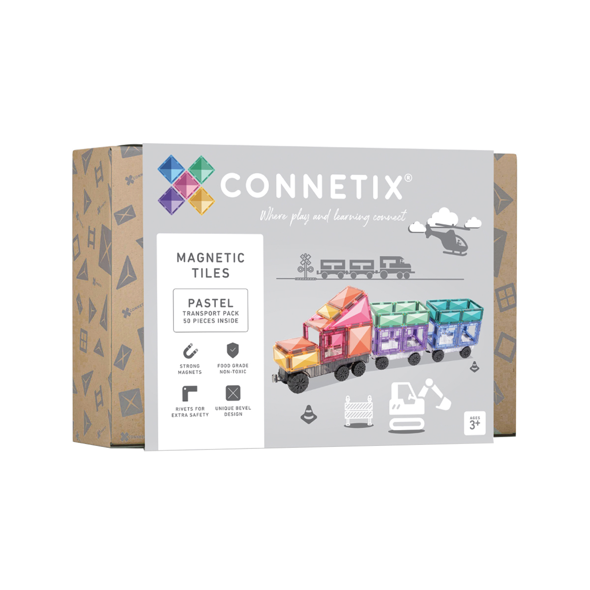 Dieses neue 50-teilige Pastell-Transportset ist perfekt für Fahrzeugfans und inspiriert Kinder zu immer größeren und aufwendigeren Konstruktionen. Es enthält eine exklusiv designte, hellgraue, wendbare Transportbasis, zwei transparente Bewegungsbasen mit echten Gummirädern und eine Auswahl an magnetischen CONNETIX-Bausteinen in erdigen Pastellfarben. Mit diesem Set sind unzählige Abenteuer für junge Köpfe möglich, während sie ihrer Fantasie freien Lauf lassen und ihre eigenen Fahrzeuge entwerfen. Von Autos über LKWs, Züge, Flugzeuge und Gabelstapler bis hin zu Feuerwehrautos und vielem mehr ist möglich! Das 50-teilige Pastell-Transportset erweitert zudem die Farbpalette der Kinder mit acht Pastellfarben in Nuancen von Rosa, Beere, Pfirsich, Mint, Smaragdgrün, Zitrone, Violett und Saphir. Ideal, um spielerisch MINT-Lernen zu fördern, während Kinder Magnetismus, Formen und Farben beim Bauen entdecken.