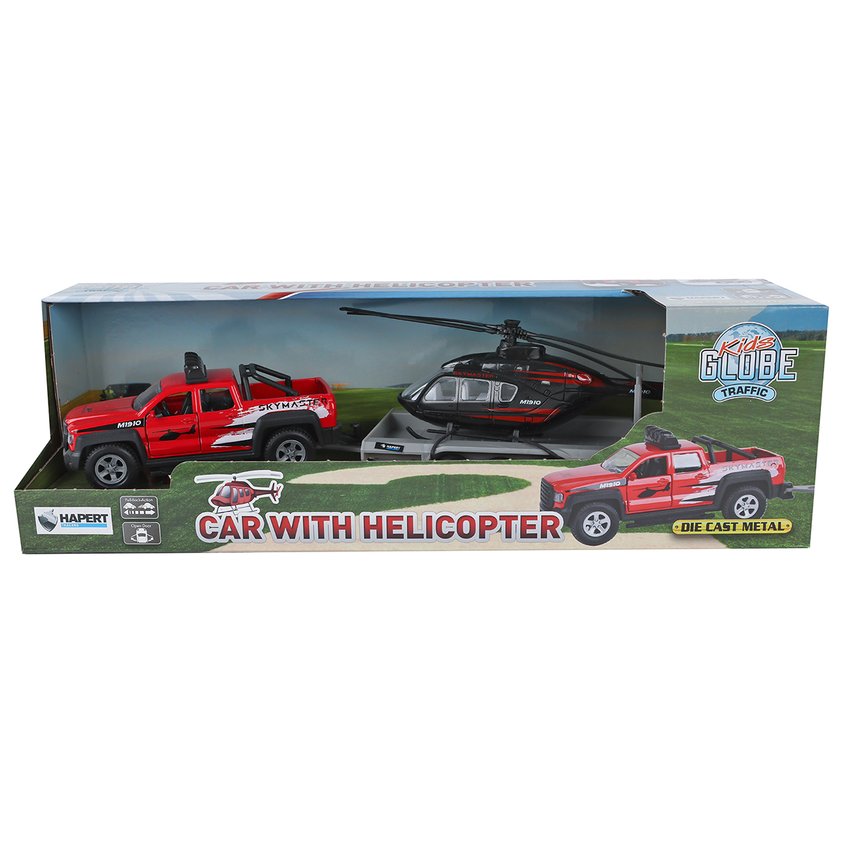 Die Cast Geländewagen mit Anhänger und Helikopter.