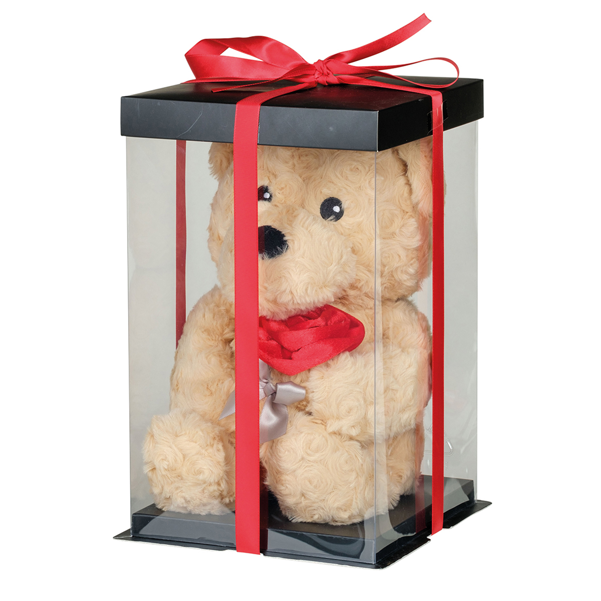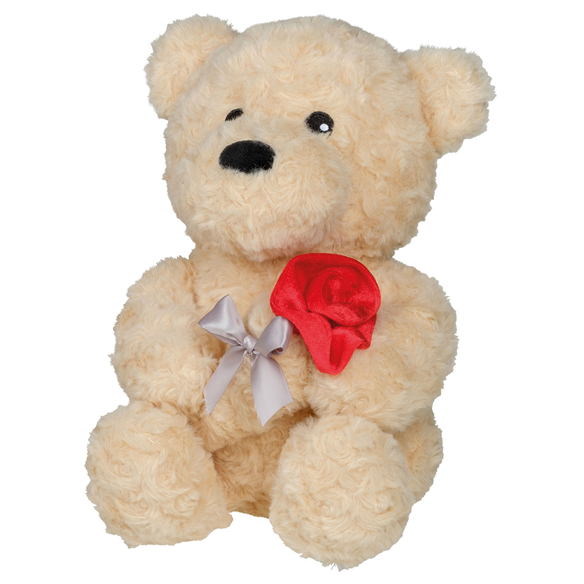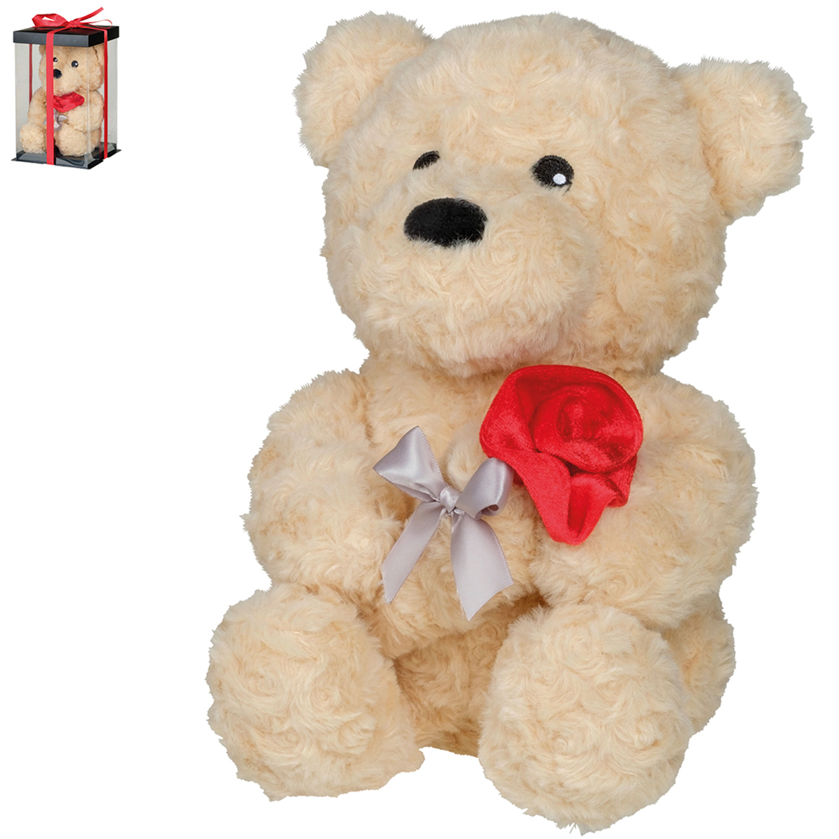 Plüschbär beige mit Rose, 25cm, lockiger Plüsch, sitzend, in transparenter Geschenkbox.