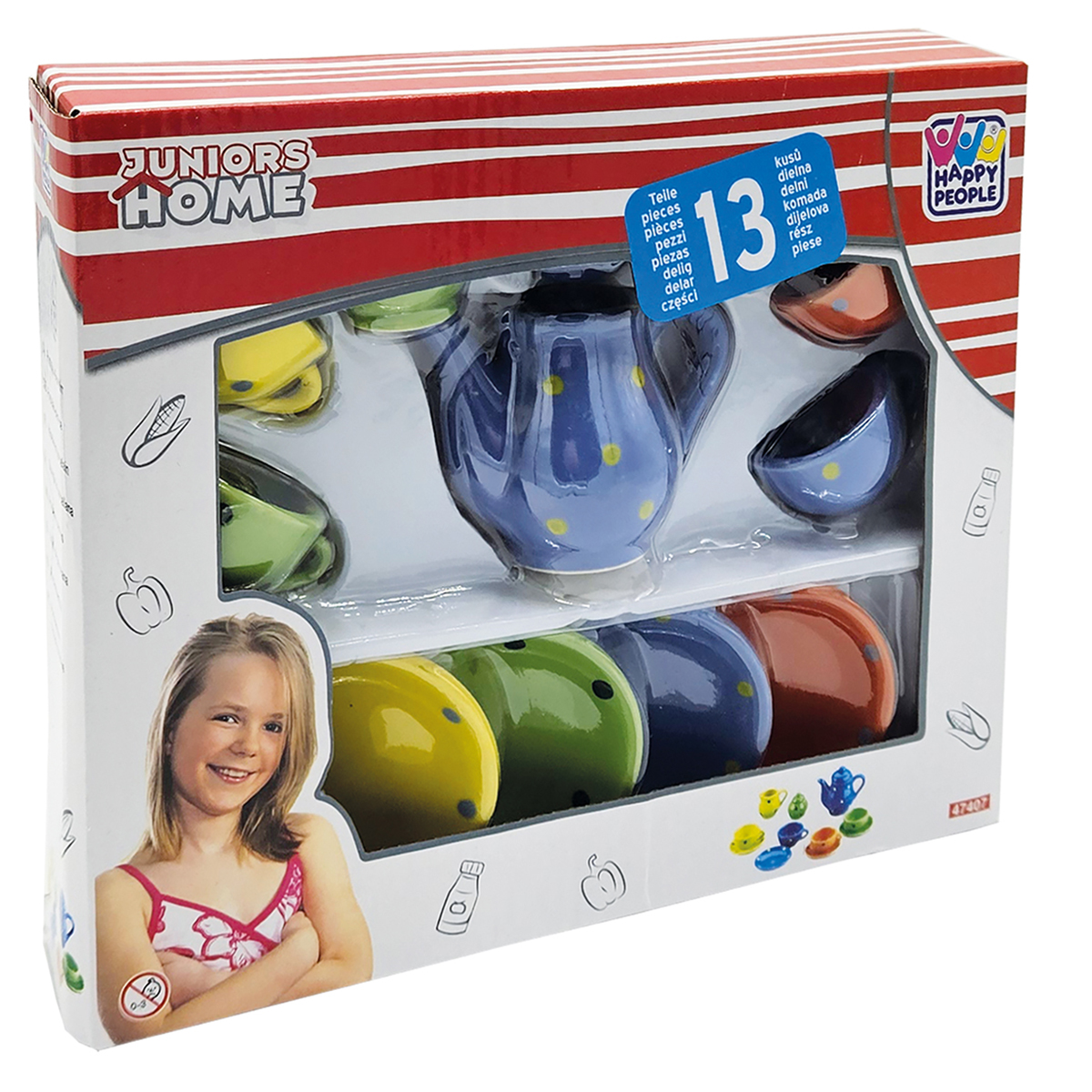 Porzellan-Geschirr Set 13-teilig, bunt bemalt. Dieses hübsche Kaffee-oder Teeset enthält je 4 Tassen und Teller, ein Milchkrüglein, ein Kaffee/Teekrug und eine Zuckerdose mit Deckel.