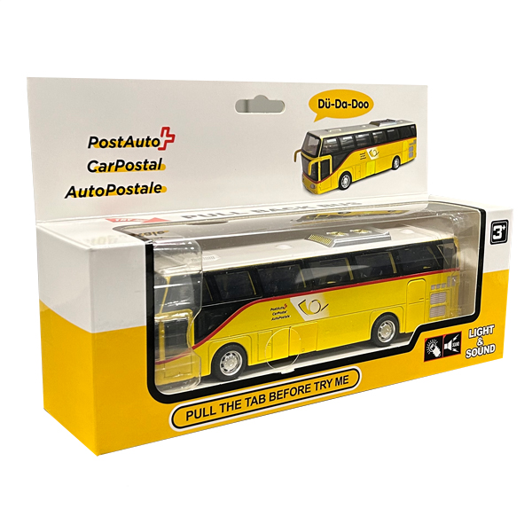 Postauto Bus mit Licht und Sound Dü-Da-Doo, Rückzugfunktion, aus Spritzguss, in Fensterbox.