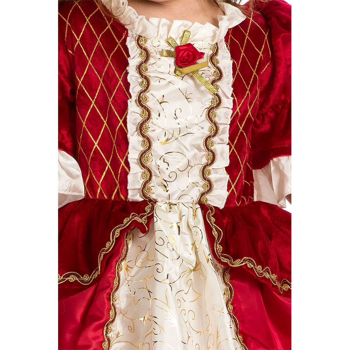Dieses Kleid ist ein echter Klassiker und perfekt für Herbst, Winter oder eigentlich jede Jahreszeit. Es ist eine ideale Ergänzung für die Kostümsammlung Ihres Kindes. Das tiefrote, dehnbare Samtoberteil ist mit einem Steppmuster, goldenen Borten und einer roten Rose verziert. Die halblangen Ärmel mit goldenen Borten enden in einer wunderschönen weißen Rüsche. Der rote Rock aus Chinaseide mit einem elfenbeinfarbenen Einsatz in glitzerndem Goldwirbel rundet den luxuriösen Look dieses Kleides ab. Atmungsaktiv, seidig weich, aus 100 % Polyester.