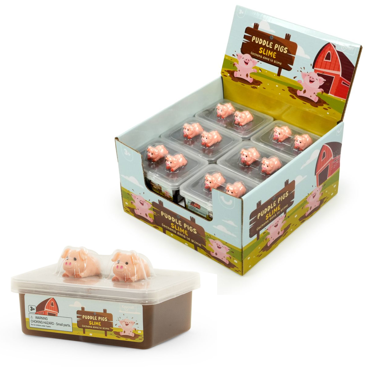 Puddle Pigs Slime mit dehnbarem, matschigem Schleich in einem Behälter im Stil einer Pfütze, auf dem zwei kleine Schweinchen sitzen.