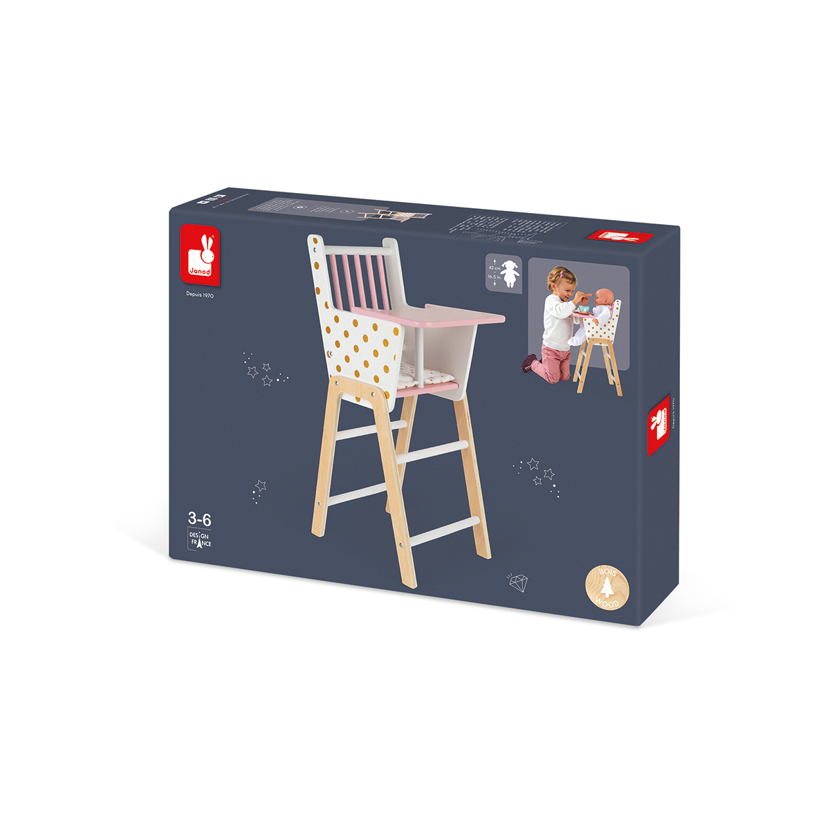 Dieser hübsche Hochstuhl mit glitzernden Reflexen ist perfekt, um die Lieblingspuppe zu füttern und zu versorgen. Dazu ein hübsches Kissen mit goldenen Punkten für mehr Komfort. Geeignet für Puppen von einer Grösse bis zu 42cm (Puppe nicht inbegriffen). Zubehör nicht im Lieferumfang enthalten. Dieses Produkt fördert: Fantasie, Entdecken und ausprobieren.