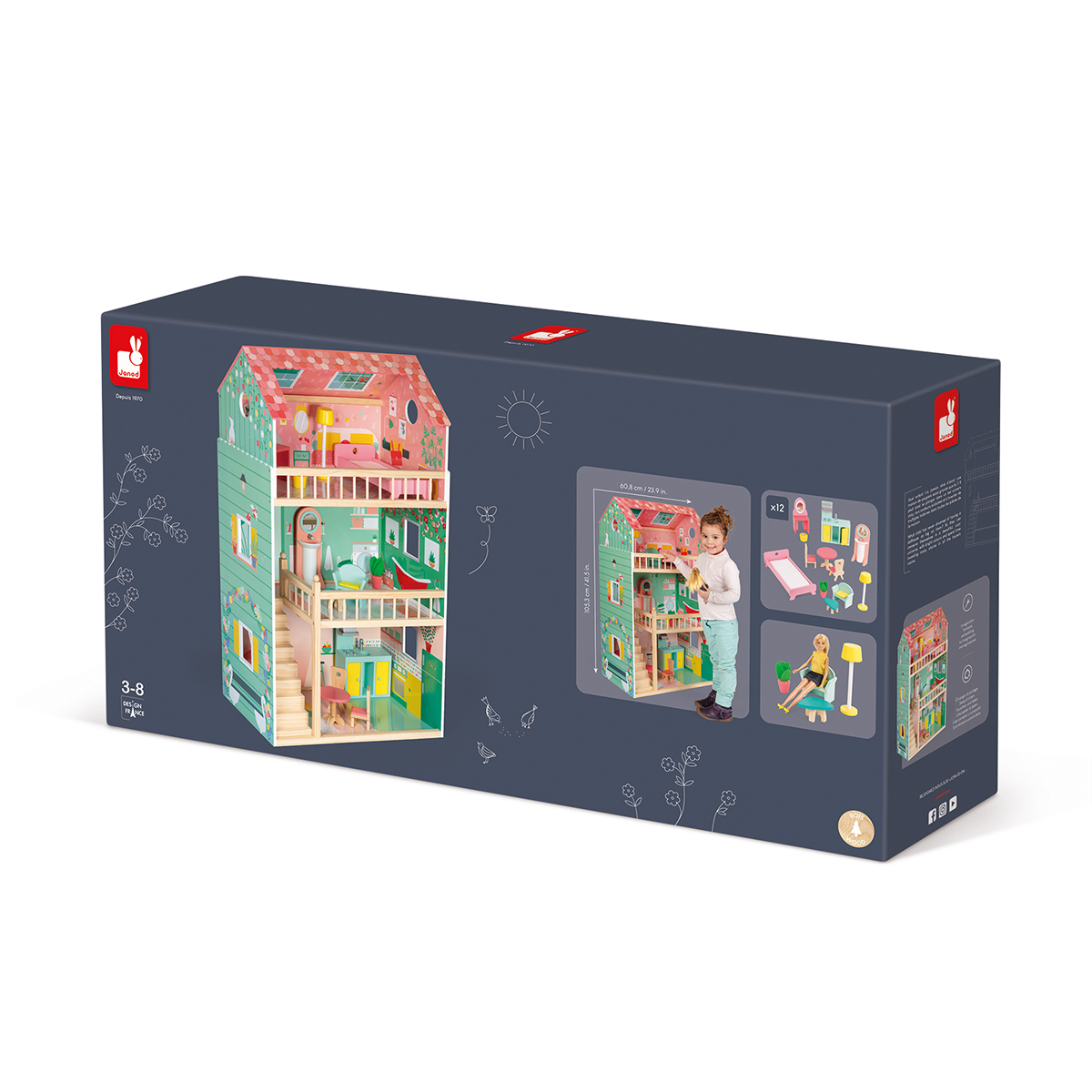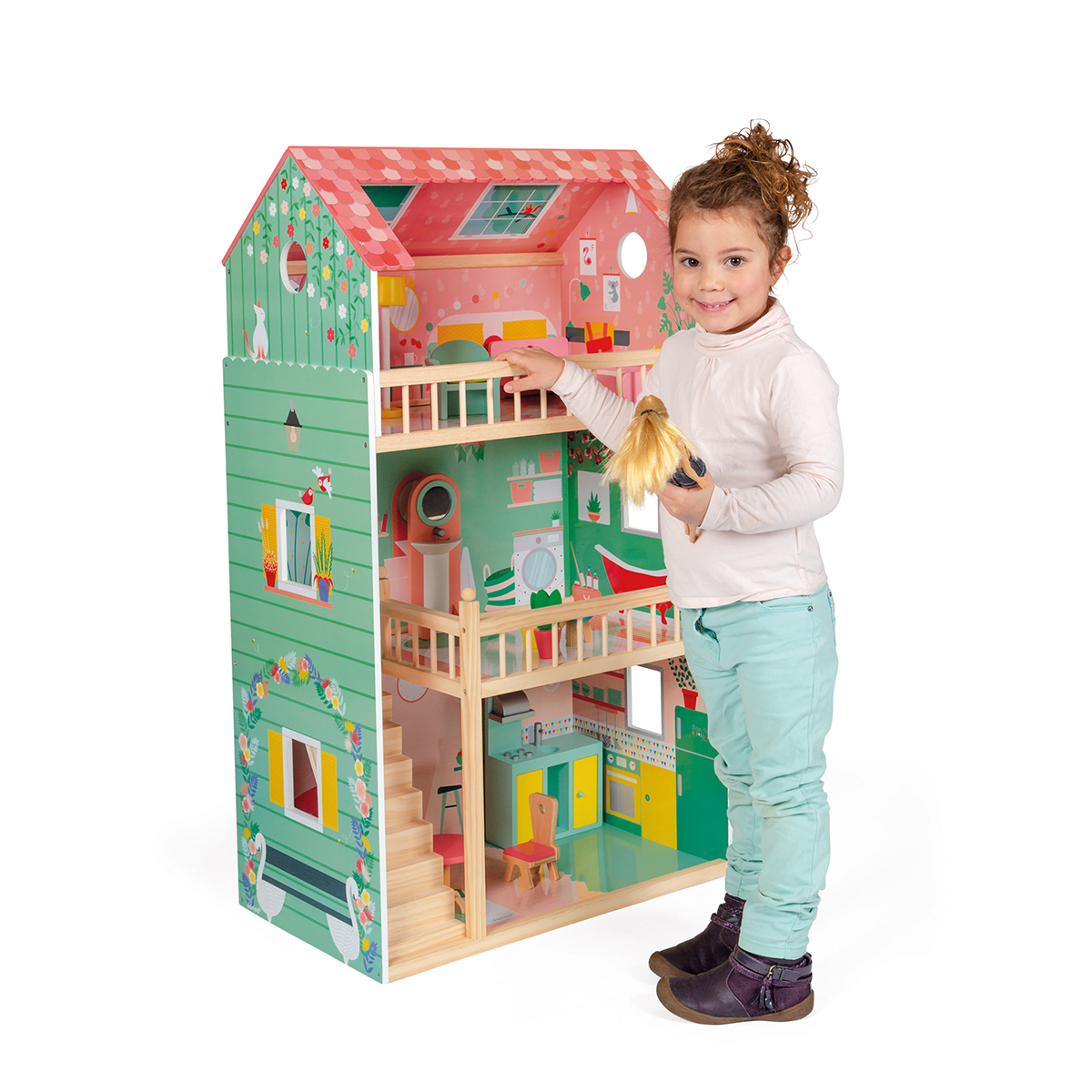Puppenhaus aus Holz. Geeignet für 30 cm Puppen. In mädchenhaften, zarten Farben. Inklusive 12 Teile Mobiliar. 3 Ebenen. Das Dach ist auf der einen Seite offen, so dass leicht im obersten Stockwerk gespielt werden kann. Ausgestattet mit einer Treppe aus Holz und 2 Geländern. Lieferung erfolgt nicht montiert. Für Kinder zwischen 3 und 8 Jahren. Grösse: 60,8 x 37,9 x 105,3 cm.