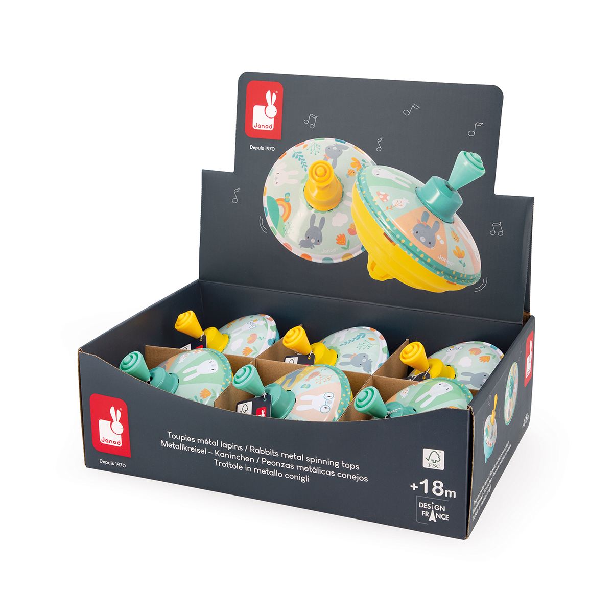 Dreh dich!! Schneller und schneller!! Die Hasen tanzen Walzer und drehen sich endlos! Diese hübschen bunten Kreisel, verziert mit kleinen Hasen (2 verschiedene Modelle), fördern die Geschicklichkeit von Kleinkindern. Drücken Sie den Hebel nach unten, damit sich die Tiere mit Höchstgeschwindigkeit drehen und der Kreisel im Gleichgewicht bleibt. Kreisel aus Metall mit Kunststoffgriff. Entwicklungsspielzeug für Kinder ab 18 Monaten.