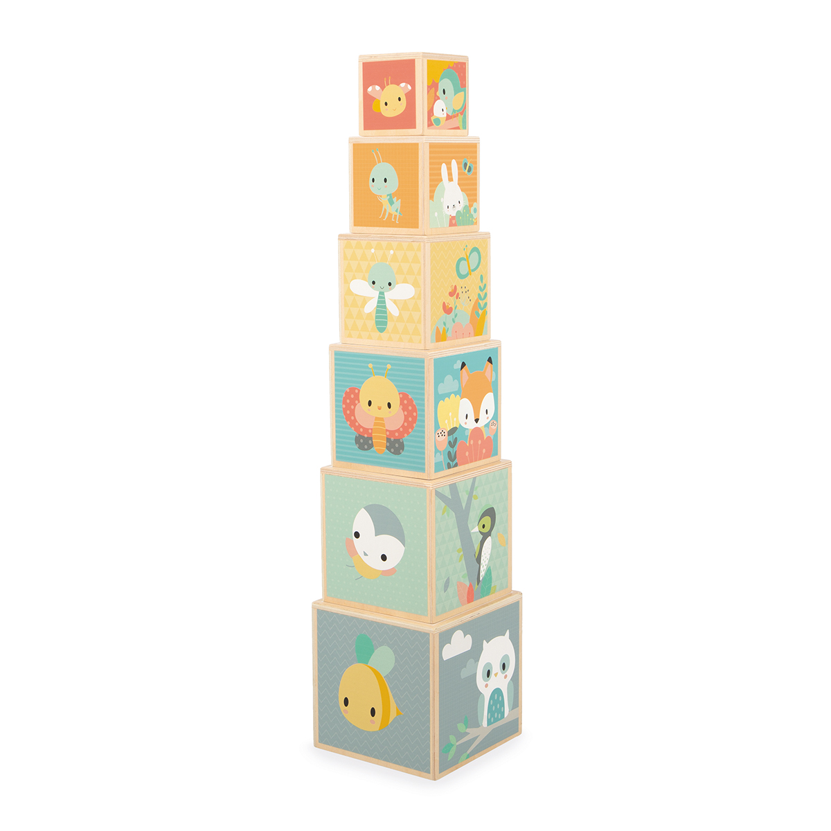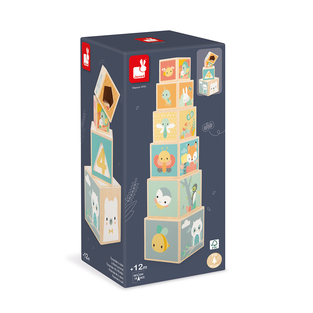 Lasst uns über uns hinauswachsen und eine hohe. Pyramide bauen! Das Spiel besteht aus 6 Würfeln mit 5 Seiten. Jede Seite des Würfels zeigt Bilder zu einem anderen Thema: Tiere, Zahlen, Formen ... Außerdem hat jeder Würfel hat eine Seite mit einem Loch in einer erkennbaren Form (Herz, Stern, Dreieck ...). Dieses schöne Bauspiel fördert die Entwicklung der Koordination und Beobachtungsgabe Ihres Kindes. Lernspielzeug aus Holz. Für Kinder ab 12 Monaten.