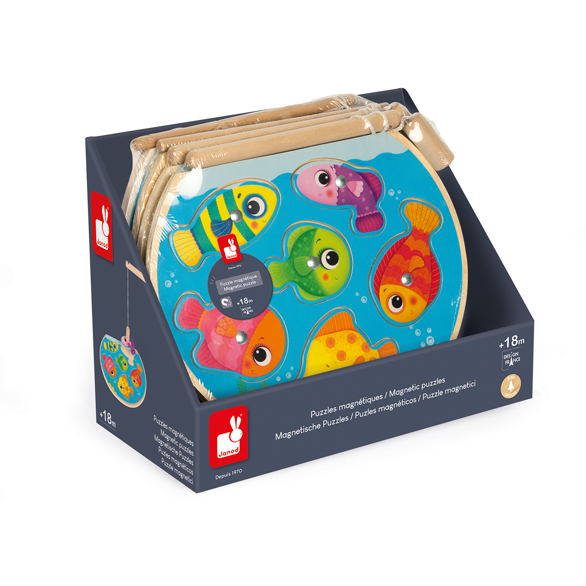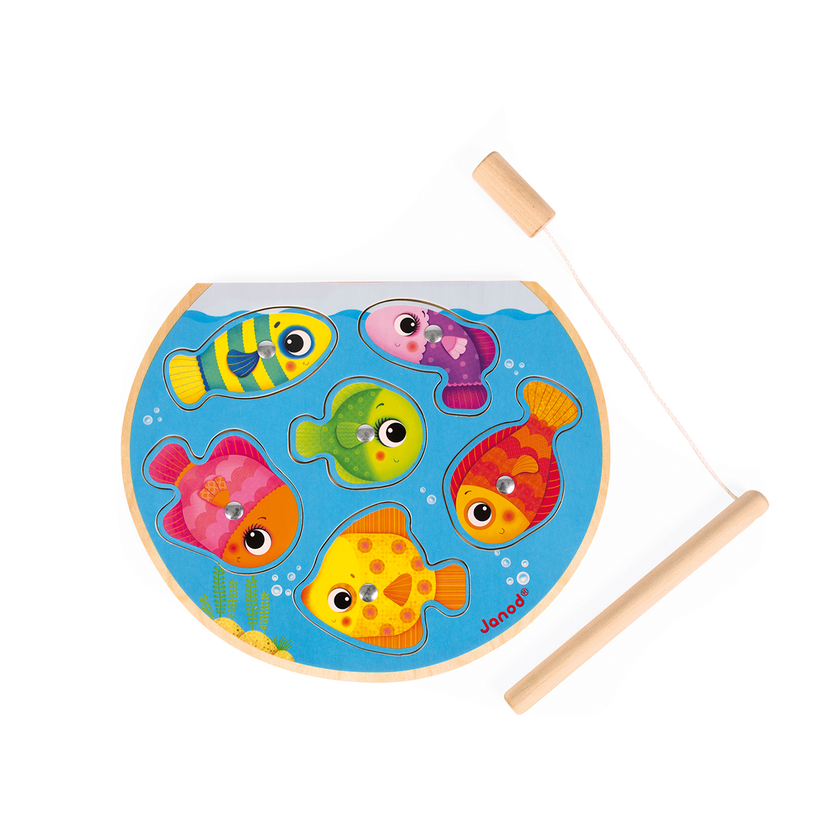 Magnetisches Puzzle aus Holz. Geeignet für Kindern von 18-36 Monaten. 6 Fische und Puzzleteile sind zu angeln. Werde Profi-Angler! Dank seiner tollen magnetischen Angelrute kann Ihr Kind spielerisch Fische fangen und lernt, diese an ihren Platz zu positionieren. Auf spielerische Weise entwickelt Ihr Kind so seine Motorik und seine Fantasie. Inklusive Angel aus Holz.