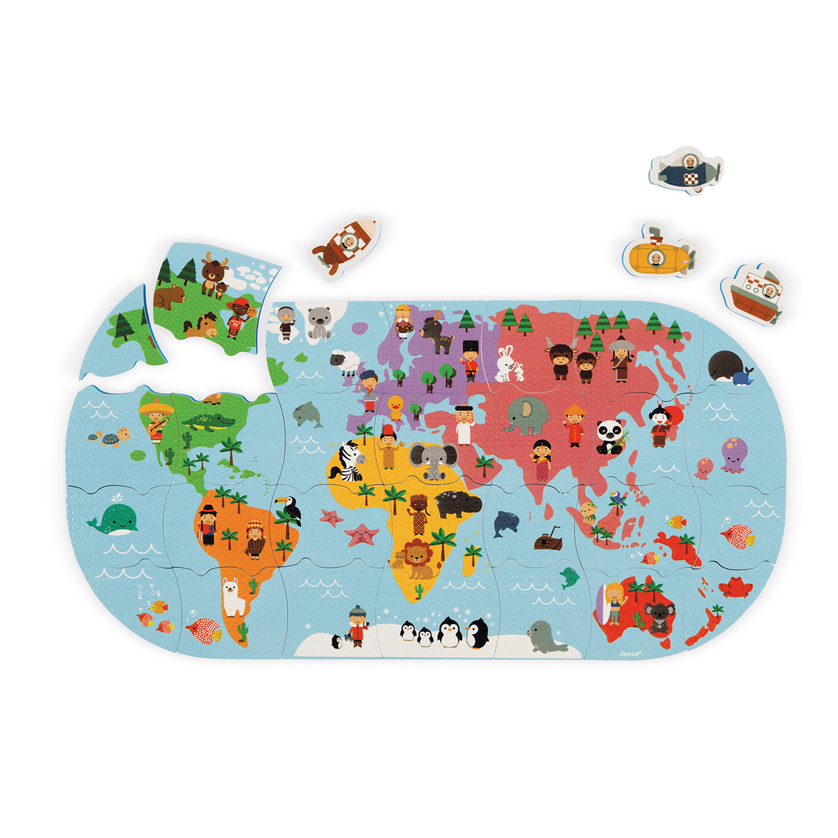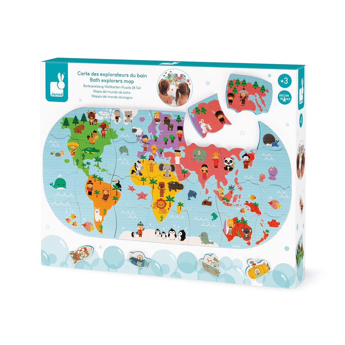 Für Kinder ab 3 Jahren. Meine erste Weltkarte zum Spielen und Lernen in der Badewanne. Viel Spass beim Reisen um die Welt mit den vier zusätzlichen Fahrzeugteilen. Tauchen Sie die Teile ins Wasser, sie schwimmen und halten an den Fliessen! 28 Puzzleteile und 4 Schaumstoff-Fahrzeuge. Inklusive ein Netz für die Aufbewahrung des Spiels.