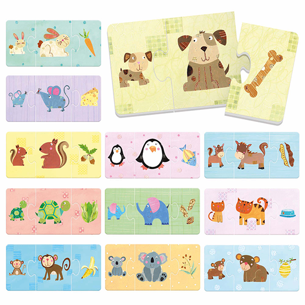 Puzzle Logic für Kinder von 2-5 Jarhe. Jedem sein Junges und sein Futter! Bei diesem lustigen Spiel musst du sympathische Tiere ihrem Nachwuchs und dem bevorzugten Futter zuordnen. Die Puzzleteile zum Selbstkorrigieren helfen dir beim logischen Denken.